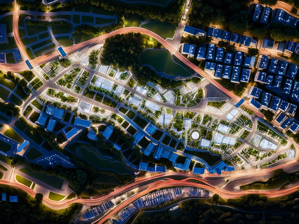 Prompt "Transforma el plan maestro en una escena nocturna realista, aplicando técnicas avanzadas de iluminación y efectos visuales. Resalta las áreas, como las zonas comerciales y los caminos principales, utilizando luces cálidas y vibrantes destellos de neón para crear un contraste atractivo. Teniendo en cuenta que las barras negras son los limites de los edificios y su geometría Desarrolla una vegetación exuberante y detallada en todas las áreas verdes, implementando una iluminación suave que realce la textura y los colores variados de la flora. Asegúrate de incluir reflejos sutiles en los cuerpos de agua indicados en celeste, añadiendo un efecto de brillo que complemente la iluminación general. Finalmente, integra un cielo estrellado para enriquecer la atmósfera nocturna y respeta fielmente las formas de los polígonos de los edificios e infraestructura vial, asegurando que cada elemento arquitectónico se integre armoniosamente en el entorno."