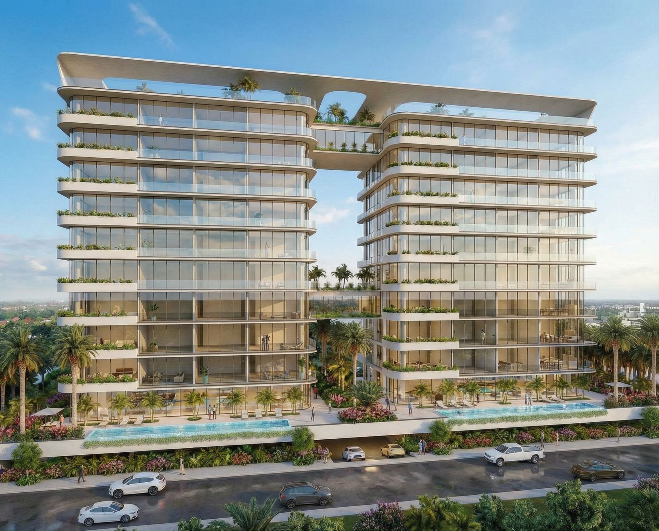 architectural exterior rendering, render this 3D mass into photorealistic rendering, Enhance this architectural façade render into an ultra-realistic, ultra-high-resolution magazine-quality image. Maintain all original shapes, glass proportions, façade geometry and landscape layout. Improve lighting with soft natural sunlight, realistic reflections on glass, crisp shadows, and a vibrant sky. Add subtle atmospheric depth, refined material textures, high-end metal finishes, hyper-detailed vegetation, and premium landscaping. Make the render look photorealistic, luxurious, sharp and elegant, with perfect color balance, ultra-clean lines, and professional post-production quality. Keep the overall composition exactly the same, keep exact camera angle, bright daylight, natural lighting, including people, vehicles, greenery and vegetation, trees, high quality, professional, detailed scene