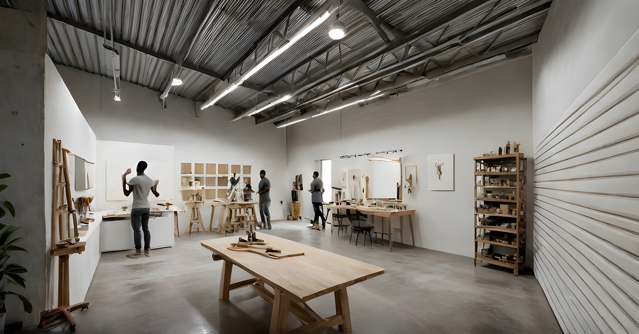 artist studio, artists making sculpture, 3 artists, black people, brown people, tools, worktables, bright, artworks in progress, white walls, cement floor