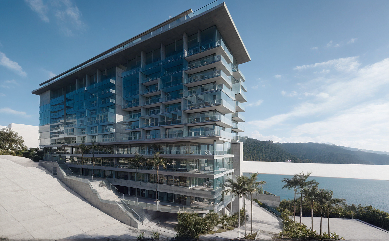 PromptBUILDING . CONCRETE ANS CLEAR GLASS FACADES. MOUNTAIN. GLASS FENCES. SORTED BLINDERS ON WINDOWS