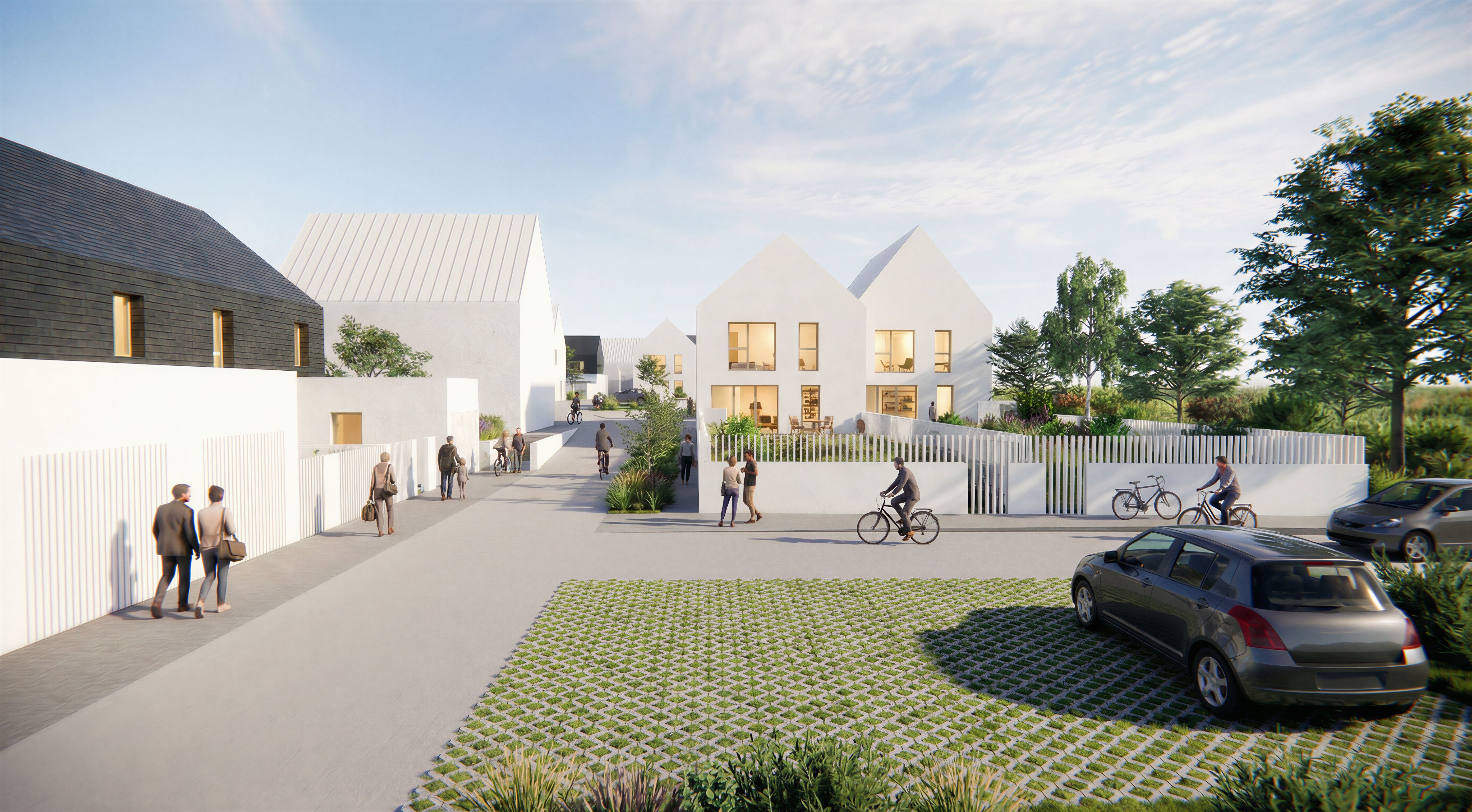keep the render as it is, do not change the composition. I want you to limit your intervention to the following points : 1- add a bit of light in the windows not to bright 2- add white plaster texture to the white wall 3-replace pavement in foreground by green parking 4-add a three in the garden at the right border of the render. 5-add fourniture in the interiors, keep exact camera angle