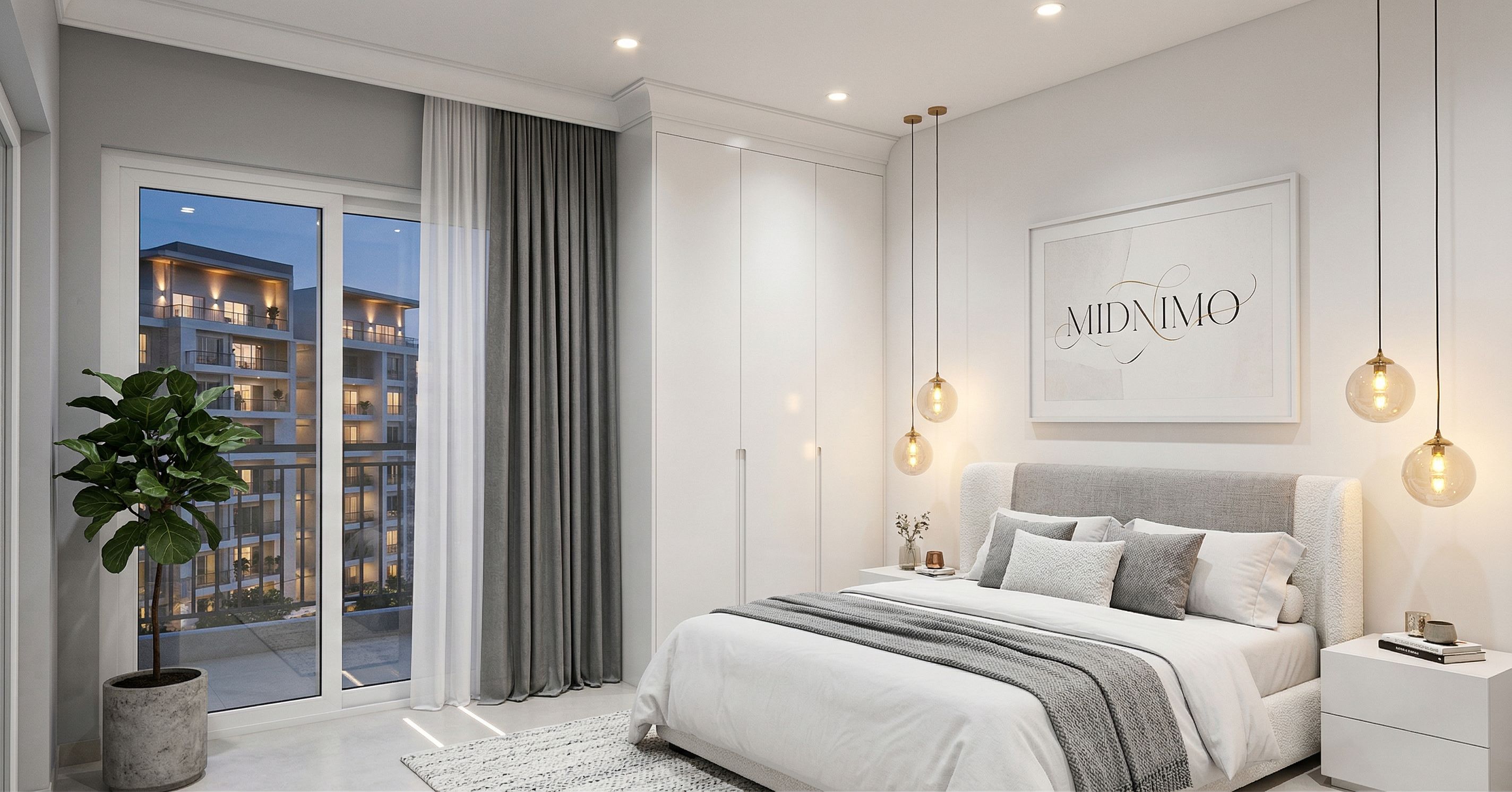 INTERIOR OF A HIGH END HOUSE VIEWED FROM THE BALCONY DOORB SHOWING A COMFORTABLE BED WITH WHITE AND GREY UPHOLSTERY. HAVE SIMPLE GYPSUM CEILING WITH SPOT LIGHTS. HAVE SOME WALL BRACKETS ON THE WALL. MAKE INTERIOR HIGH END PASTEL COLOUR. TURN ON THE LIGHTS IN THE ROOM. HAVE THE NAME MIDNIMO IN ONE OF THE ART WORK ABOVE THE BED. MAKE RESOLUTION HIGH AND PHOTOREALISTIC 8K. INTRODUCE A CURTAIN IN THE WINDOW HAVE A CLEAR SLIDING DOORS BEHIND THE CURTAIN. MAKE THE WALL PAINT A MIX OF WHITE AND PASTEL GREY. MAKE THE CURTAIN RAIL IN THE BEDROOM WINDOW BE CONCEALED IN THE GYPSUM AND BE WHITE. HAVE THE SUSPENDED LIGHTS ON EITHER SIDES OF THE BED BE OF CLEAR ROUND BALLS AND HAVE WARM LIGHTS. THE IMAGE OUTDOOR THROUGH THE WINDOWS SHOULD SHOW UPPER LEVELS OF A RESIDENTIAL .APARTMENT. MAKE THE DOORS AND DOOR FRAMES WHITE AND SAME LEVEL. MAKE THE WARDROBE WHITE AND SAME HEIGHT AS CURTAIN BOX. REMOVE THE WALL BRACKETS.MAKE WARDROBE BE SAME HEIGHT AS SLIDING DOOR. MAKE CRTAIN BE ELEGANT GREY WITH WHITE SHEARS. MAKE THE ROOM ELEGANT WITH USE OF WHITE AND PASTEL GREY ON THE WALLS., keep exact camera angle
