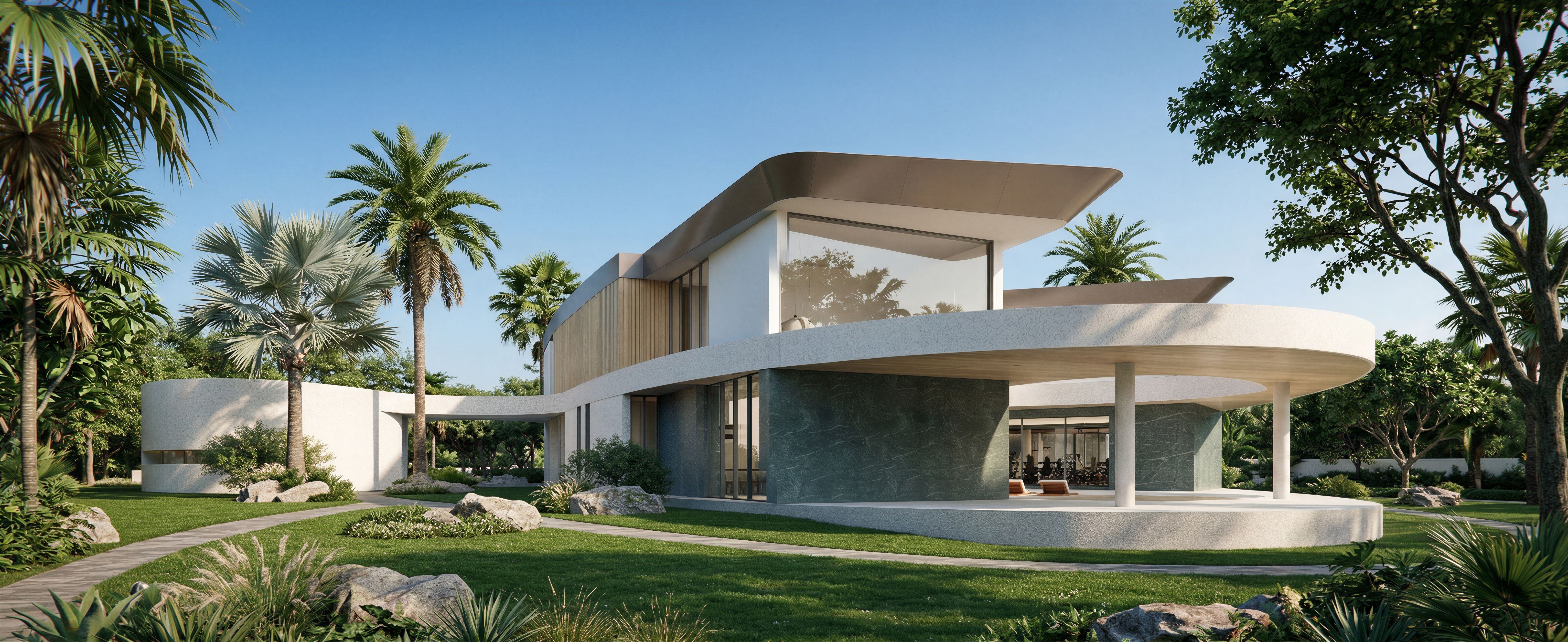 EnhancedPromptPhoto of an ultra minimal luxury villa, showcasing sleek curved off white and dark greenish gray stone architectural elements with large glass windows, natural wood accents and Brown-grey metallic roof edge. Surrounded by a tropical lush green lawn, boulders, and big trees, integrating with the tropical landscape. The bright afternoon sun casts soft shadows, enhancing the textures of the materials. Captured from a low angle to emphasize the building's dynamic forms and the interplay of light, using a wide-angle lens for a sense of grandeur and openness., keep exact camera angle, keep exact camera angle