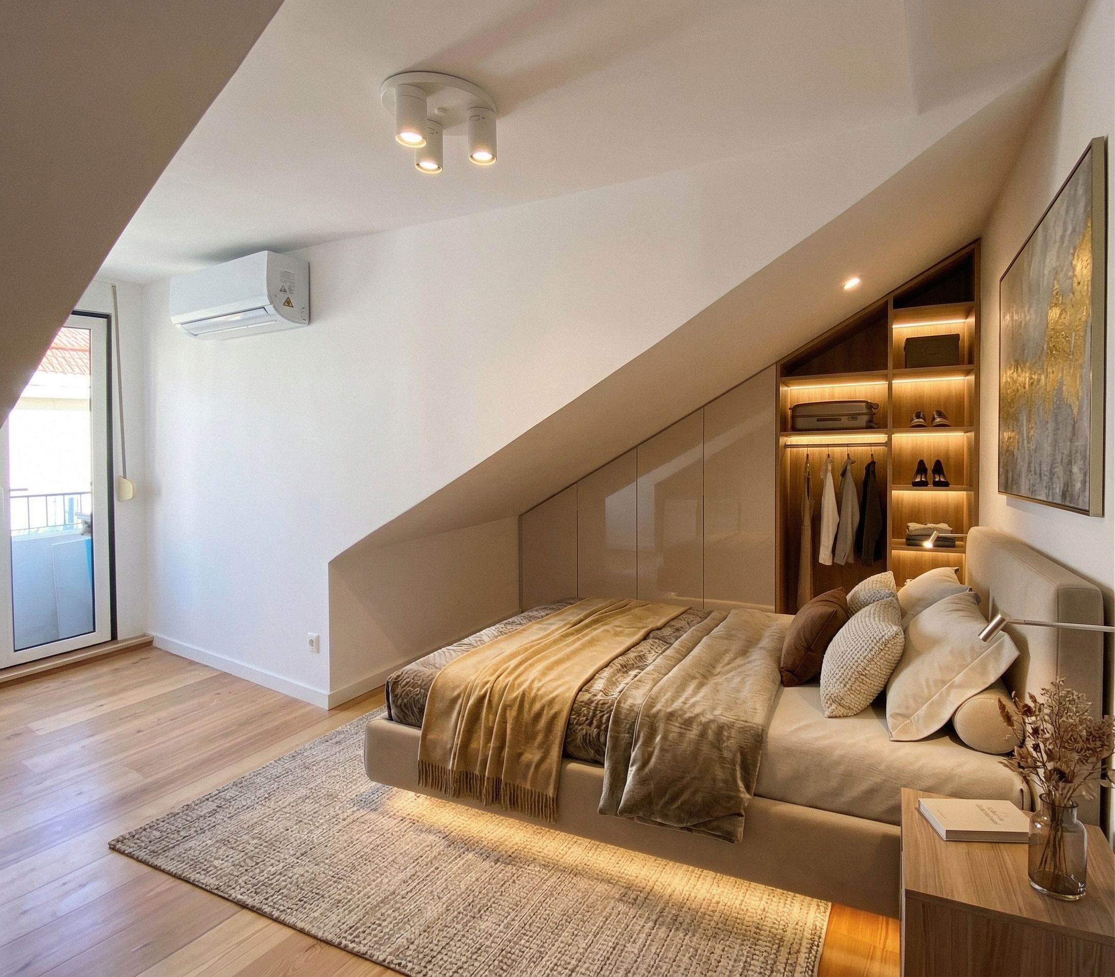 PromptfAZER DECORAÇÃO CONFORME REFERÊNCIA DO QUARTO CONFORME LAYOUT DA FOTO, colocar a cama com a cabeceirta na parede da direita com os pés da cama para a janela. Luzes acesas , keep exact camera angle