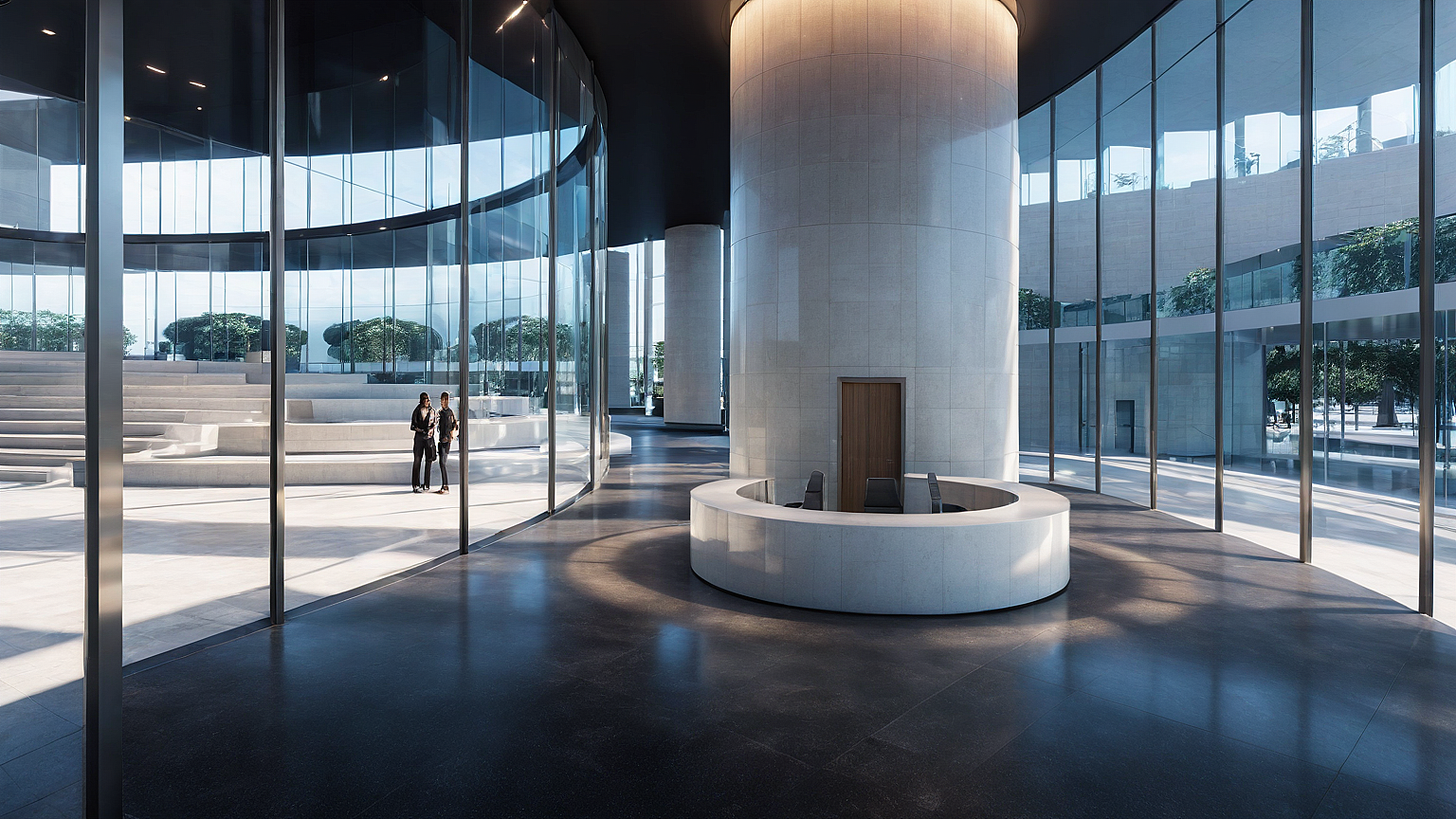 Render this lobby space. Add lighting and enhance the cylindrical glass tube in the middle to be a circular glass lift with a steel structure. Enhance floor materials too.