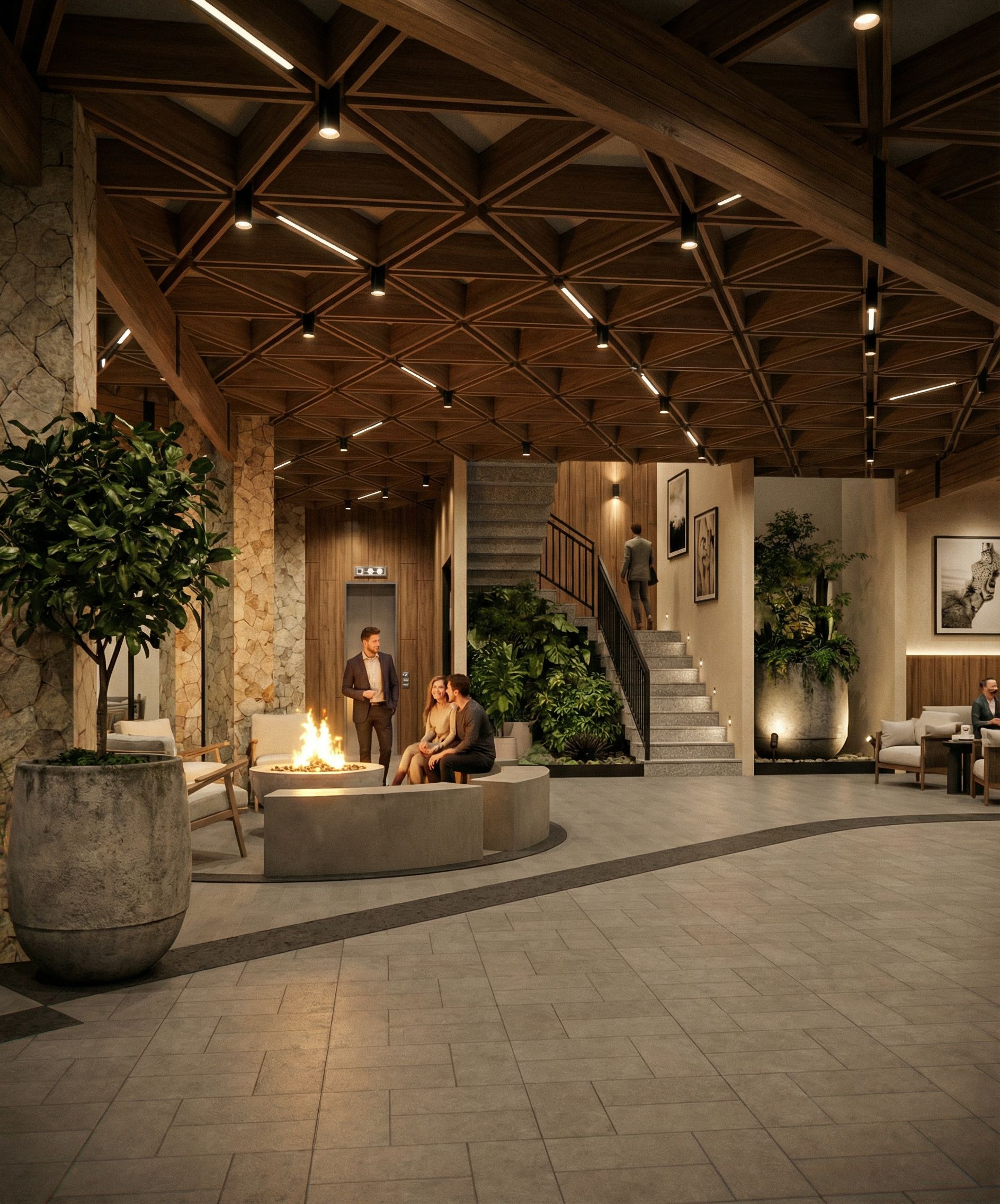 HIGH-END PHOTOREALISTIC RENDERING of a boutique hotel motor lobby, designed to evoke warmth, exclusivity, and a refined sense of arrival. The space features a neutral gray general-purpose tile floor and granite-style stair treads in a 7x30 cm format, with subtle variation and natural texture, carefully scaled as shown in the reference image. Overhead, a natural matte walnut wood ceiling arranged in a precise grid composition adds warmth and craftsmanship, integrated with 10 cm high black tubular linear light fixtures placed at ceiling intersections, emitting a soft, warm, hospitality-grade glow. Lighting is intimate and layered, enhancing textures and creating a welcoming nighttime ambiance. A large sculptural planter with an aged concrete finish serves as a focal element, containing a mature lush plant with organic, slightly asymmetrical foliage. Next to the staircase, a curated green zone with dense yet elegant vegetation reinforces the boutique hotel identity and biophilic design approach. Architectural columns are clad in local San Cristóbal de las Casas flagstone, highlighting regional identity through authentic stone texture, irregular joints, and handcrafted appearance. Matte black metal railings and hardware remain minimal and refined, providing contrast without visual weight. A low-profile fire pit with an aged concrete aesthetic introduces warmth and a subtle sense of luxury, with gentle firelight reflections on surrounding surfaces. Vertical planes are enriched with natural matte walnut wood paneling, adding depth, rhythm, and a sense of artisanal quality. The rendering should emphasize cinematic composition, soft shadows, global illumination, realistic material response, and ambient occlusion, captured with a wide-angle architectural lens at eye level, ultra-high resolution, and carefully controlled contrast for a timeless boutique hotel atmosphere. Show the entire image area as it was uploaded , keep exact camera angle