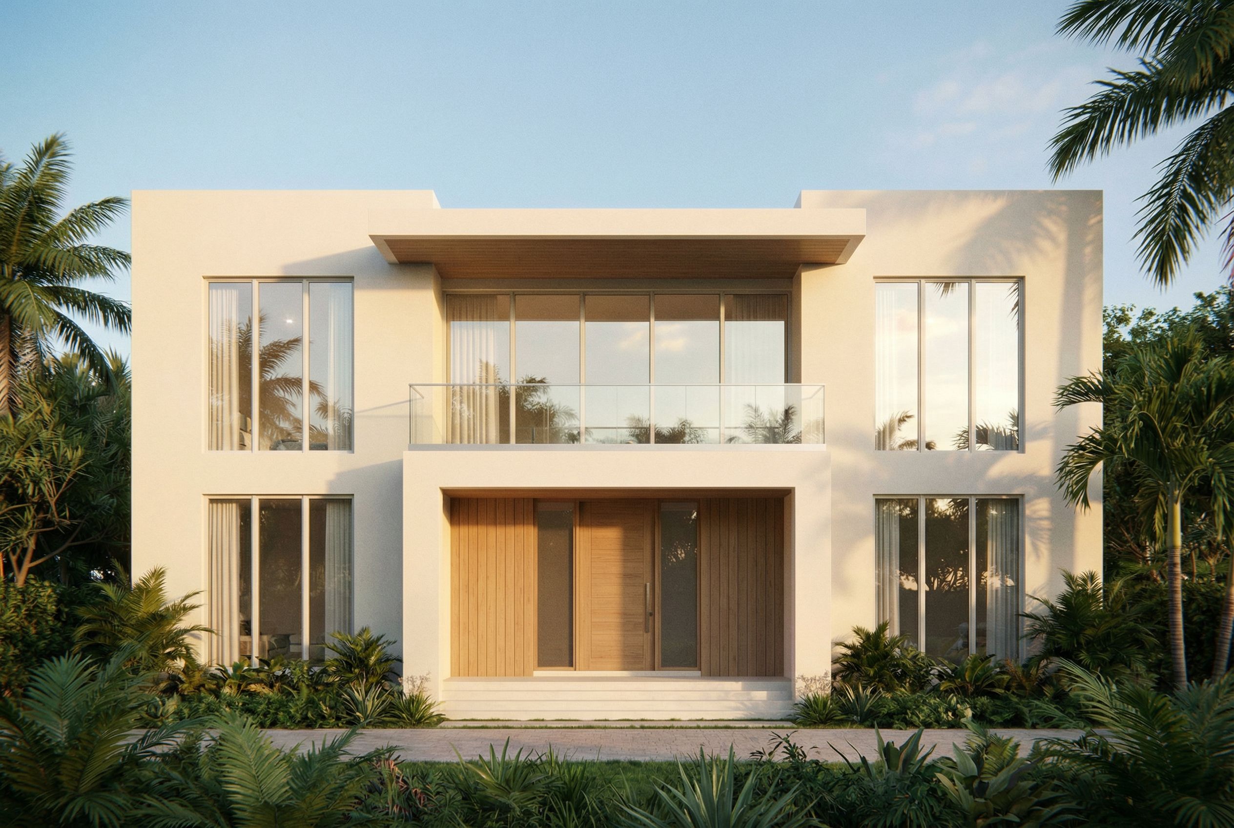create dreamy cinematic view of the front of this house based on the provided front elevation. there is an entry loggia that is 8'-4" deep in total. the balcony above is 15'8" deep in total. the wall with the sliding glass doors sits further back then the wall with the front door. above the sliding glass doors is a roof overhang of 6ft. the entire balcony is not covered only 6ft of it. the two walls with the windows on both the lower and upper floor sit in line with eachother. these walls sit 2'2" forward of the roof overhang. the main body of the building is a smooth cream stucco. everywhere that is blue is glass. the balcony railing will be a seamless glass railing. the front door will be wood, and it has two sidelights adjacent to it. the front door is on an accent wall of wood paneling. the wood paneling should have a high end look in a neutral wood color. like pecky Cyprus, but with a grain that is not so pronounced. everywhere where there is the vertical hatch is going to be the same wood paneling. where the front door is. this wood paneling seamless blends into a breeze screen that covers the sidelight windows. the breeze screen will be in the same material and color as the rest of the wood paneling. see the provided photos for material color and finishes inspiration. this rendering should be a cinematic, realistic dreamy render. this is an approximately 15,000 sqft house located in palm beach Florida. , keep exact camera angle