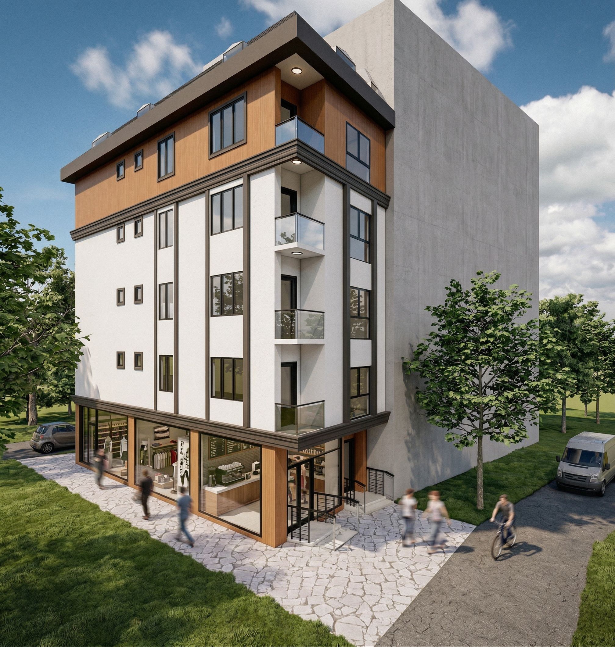 Photorealistic exterior render of a modern apartment building,Realistic daylight, V-Ray style, high detail, glass reflections, realistic shadows,ground floor shopping,wooden parts are plain without a pattern, keep exact camera angle