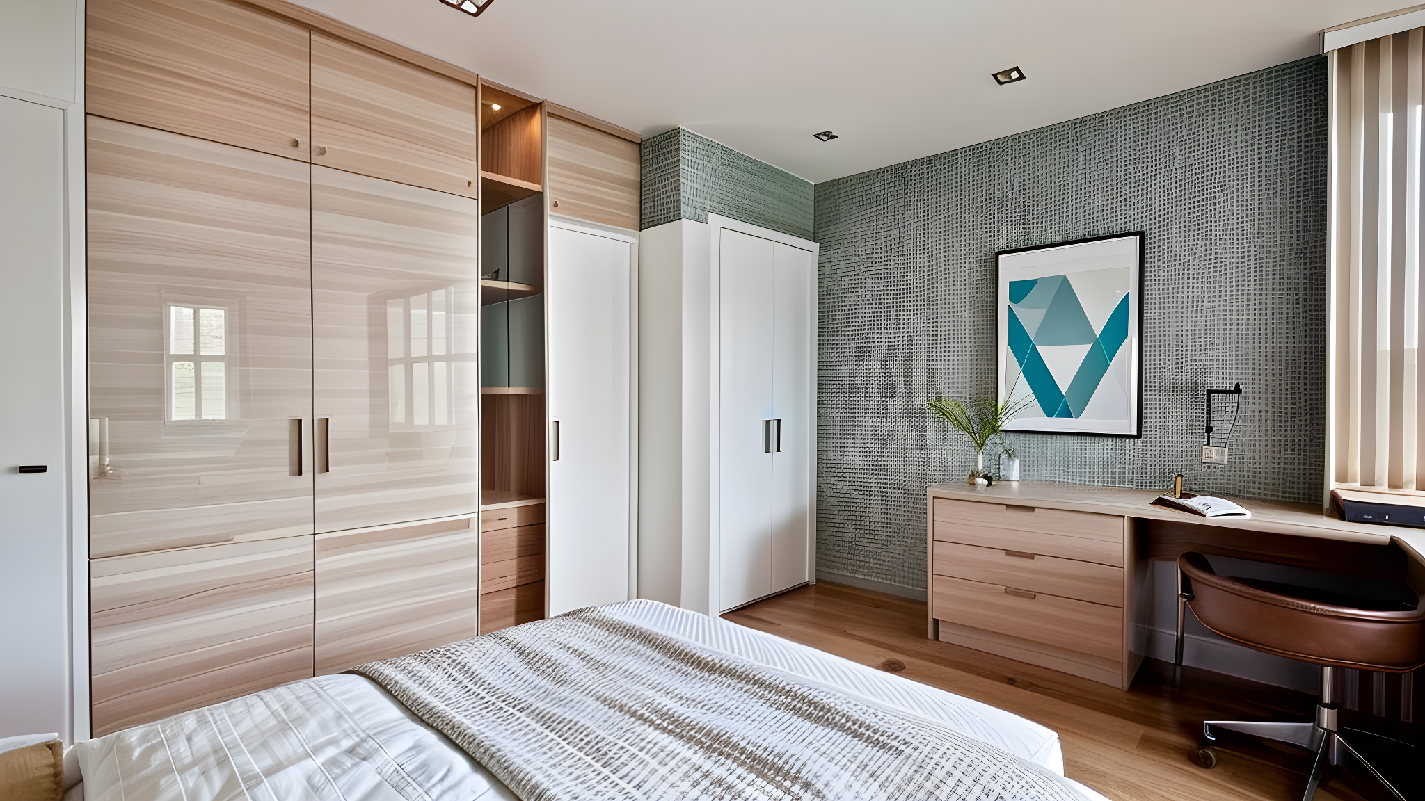 Promptbedroom, natural light, light colors, wood and white furniture, modern and clean