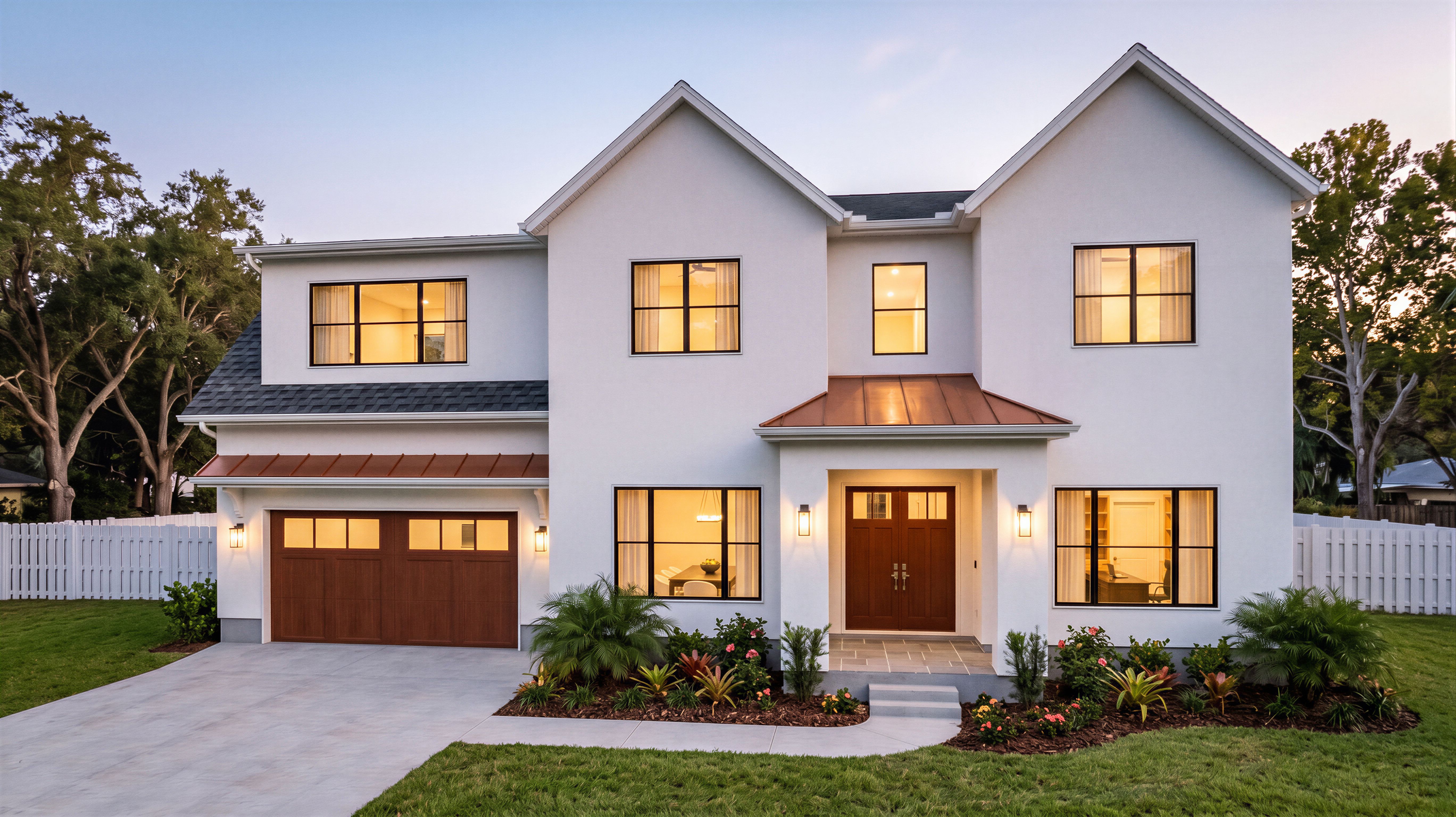 EnhancedPromptMake photo-realistic renderings of this house image; Exterior walls are smooth finish white stucco; Roof above garage door is standing seam copper; Roof above entry door is standing seam copper; Other roofs are shingle Pewter Gray Timberline UHDZ® UltraMat shingles from GAF, use Reference Image 1 for the shingle roof; In front of the house is grass, light brown ground areas flanking the porch entry are flower beds, make flower beds typical for Florida; Driveway is clean, no dirty spots; Exterior lights are on; Lights are on in the interiors; Add semi-transparent curtains inside for the windows; Make curtains lighter colors; No window treatment for the window above the entry roof; Do not add additional items inside of rooms; Use Reference Image 2 for a background of the house; Do not change doors geometry; Do not change doors geometry; Do not change doors geometry; Do not change windows geometry; Do not change windows geometry; Do not change windows geometry; Keep the exact camera angle; Keep the exact camera angle; Keep the exact camera angle;, keep exact camera angle