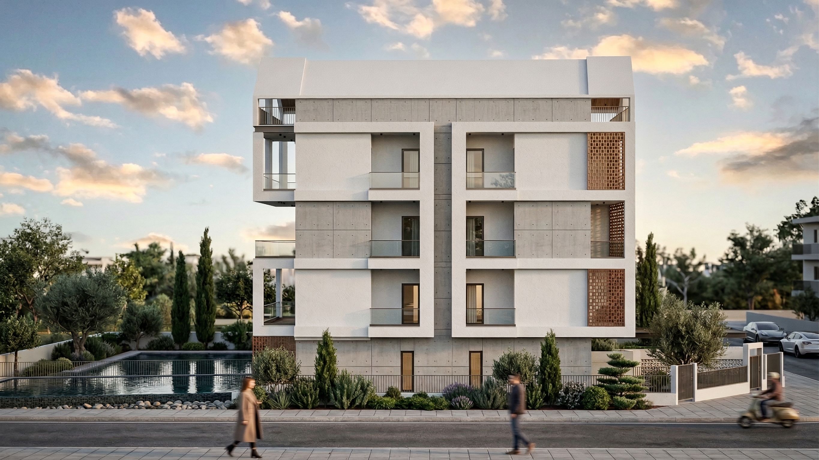 Modern block with large windows, materials such as concrete,plaster,metal, white clauster surrounded with greenery.With no poolDONT CHANGE THE PERPESPECTIVE. THIS IS ΝΟΤ THE FRONT SIDE OF THE BUILDING, keep exact camera angle