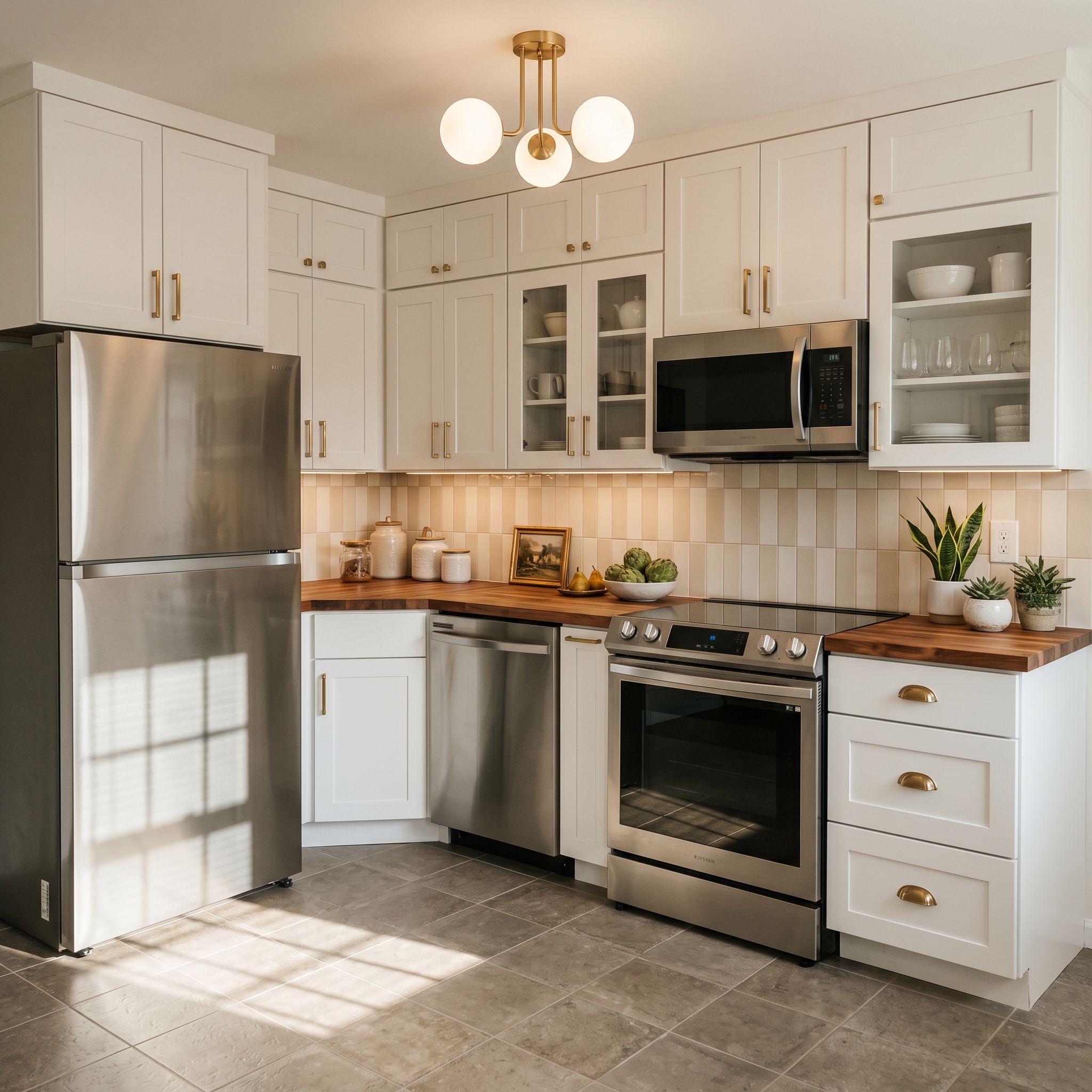 PromptKeep the layout the same. Refresh this kitchen with stainless steel appliances and new finishes to match those shown in the reference image. The cabinets should be a bright white. The counters should be butcher block. The backsplash should be vertical stacked almond colored subway tile in gloss/matte pattern. The ceiling light fixture should be changed. The flooring should be a warm gray lighter colored tile. The upper cabinets should go to the ceiling. add a microwave above the range. , keep exact camera angle