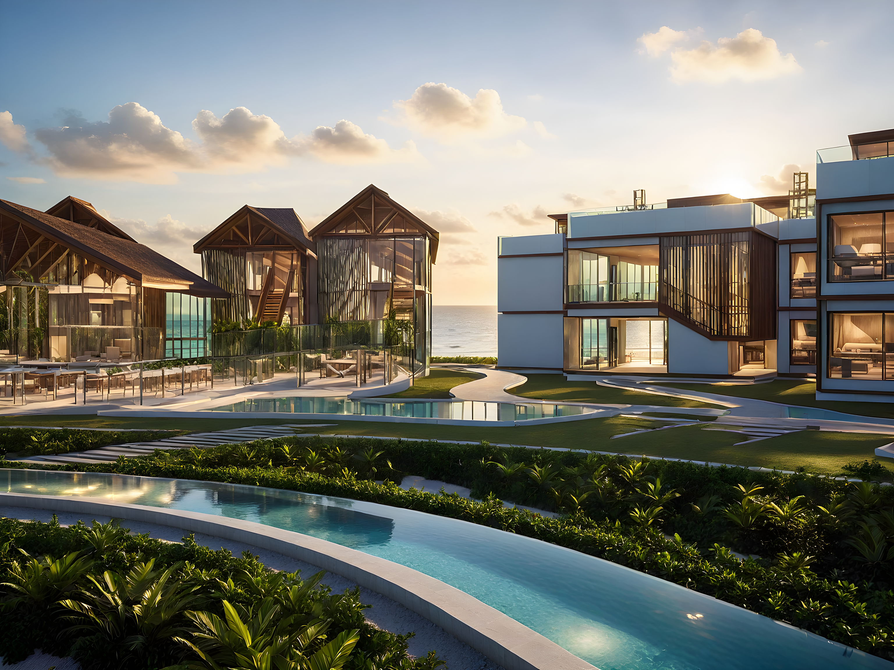 PromptLuxurious beachfront resort surrounded by lush tropical greenery, featuring modern curved and linear architecture. The buildings have large glass facades, reflecting the sunlight, and are arranged around serene pools and landscaped gardens. The resort includes multiple amenities like tennis courts, a sports complex, and private beachfront villas. The design integrates natural elements with contemporary elegance, blending seamlessly with the coastal environment. Aerial perspective with golden lighting for a warm atmosphere.