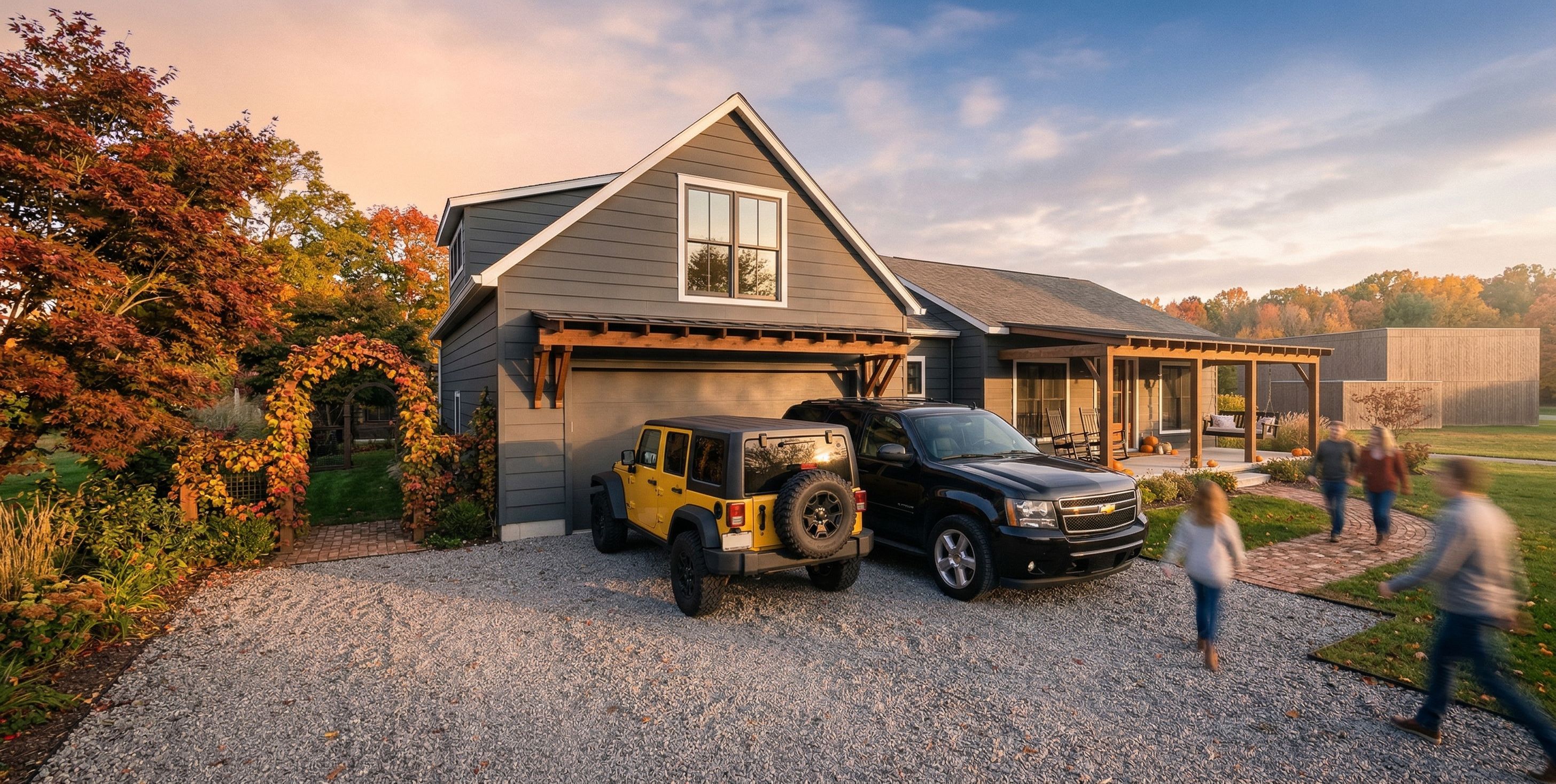 Promptcrisp fall morning, just after sunrise, gravel driveway. brick walkway., keep exact camera angle