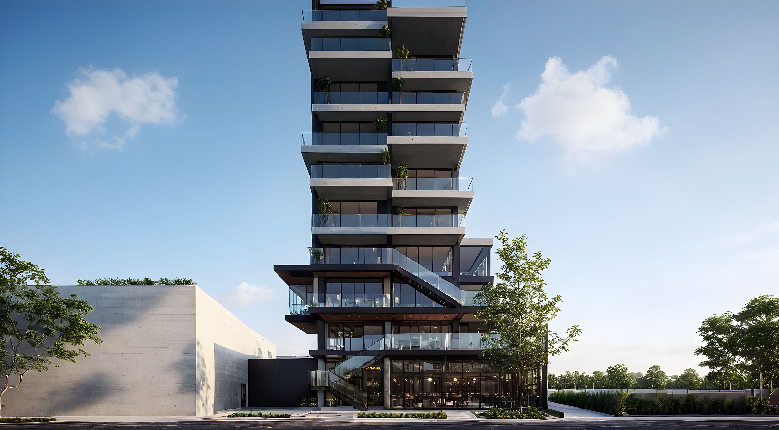 PromptModern residential building with a bold facade: black from the first to fifth floor, transitioning to raw concrete above. Bathed in warm afternoon sunlight, its textures and materials stand out. Lush hanging planters, glass railings, and sliding doors enhance its design. A vibrant urban plaza in front features greenery, seating, and ambient lighting. The ground floor hosts a lobby and café, with offices above and residences on the top floors.