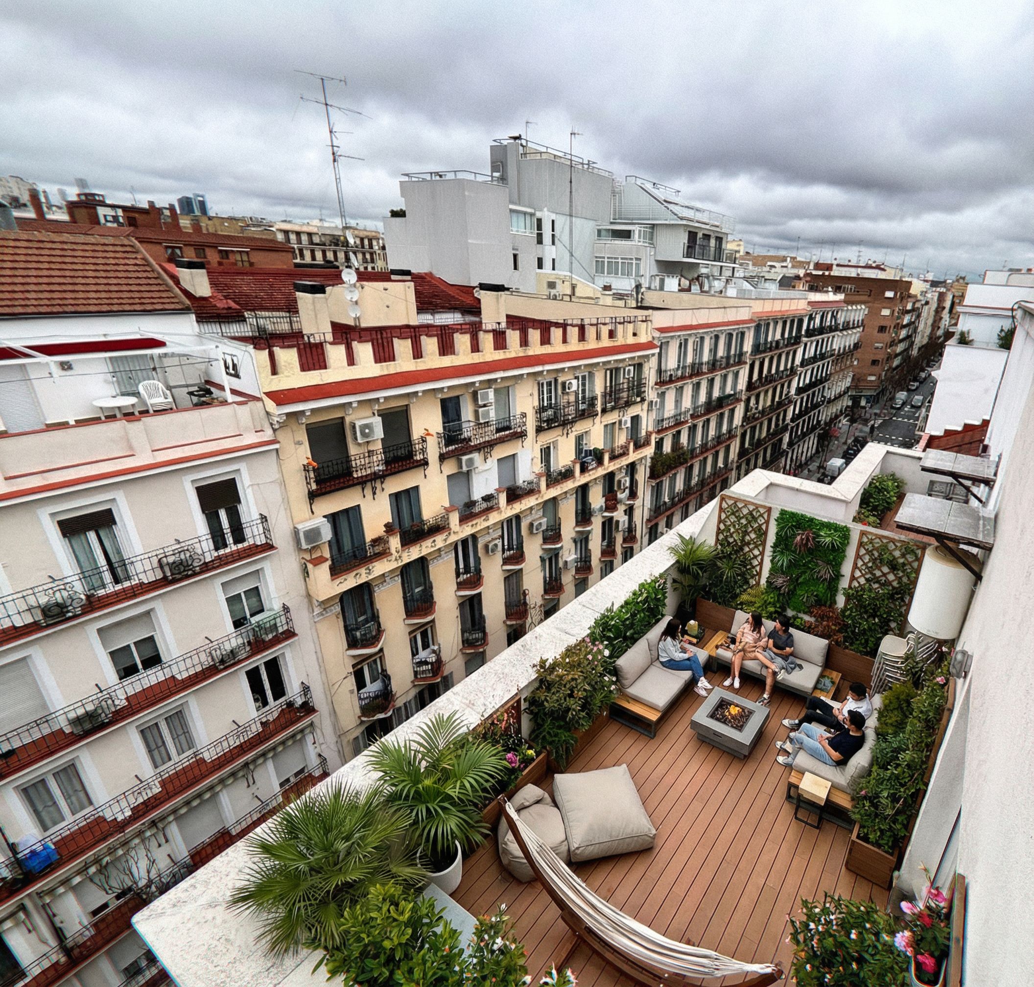 PromptCON EL MISMO FONDO Y LA MISMA FORMA, crea una terraza moderna con zonas chillout, plantas, suelo de pvc madera , keep exact camera angle, keep exact camera angle