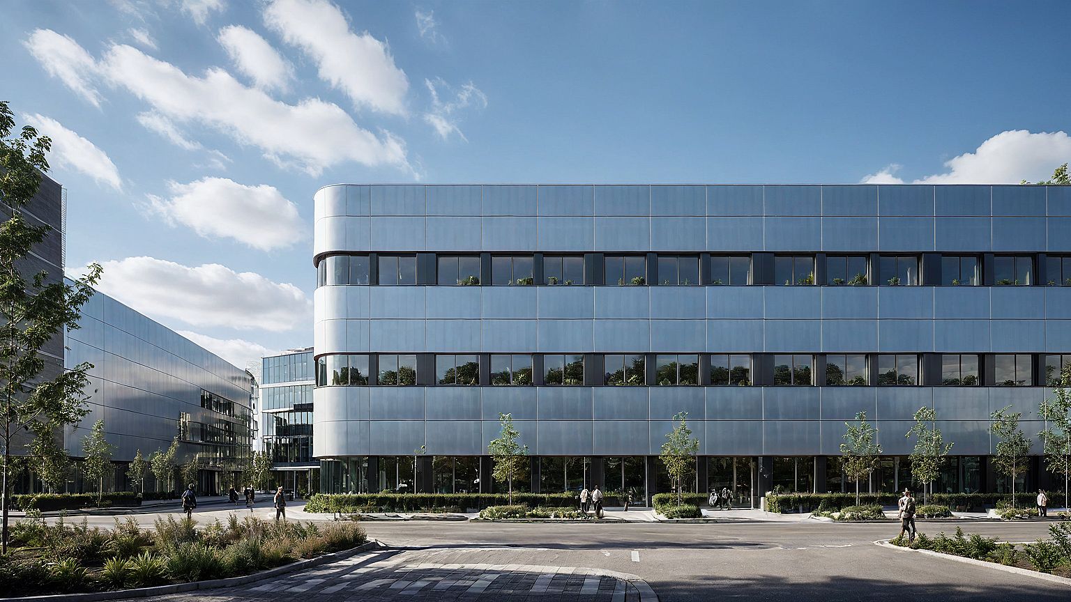 Photo of a modern commercial building, characterized by smooth, vertikal small metallic panels in different colour tones and large rectangular windows. The façade reflects contemporary architectural design, emphasizing sleek lines and minimalistic details. Set against a clear blue sky with scattered clouds, the natural lighting enhances the building's clean surfaces. Captured from a straight-on angle, the lens focuses on the façade, showcasing the interplay of light and shadows across the materials, highlighting textures and architectural elements. In the foreground lots of vegetation and working people in a urban environment.