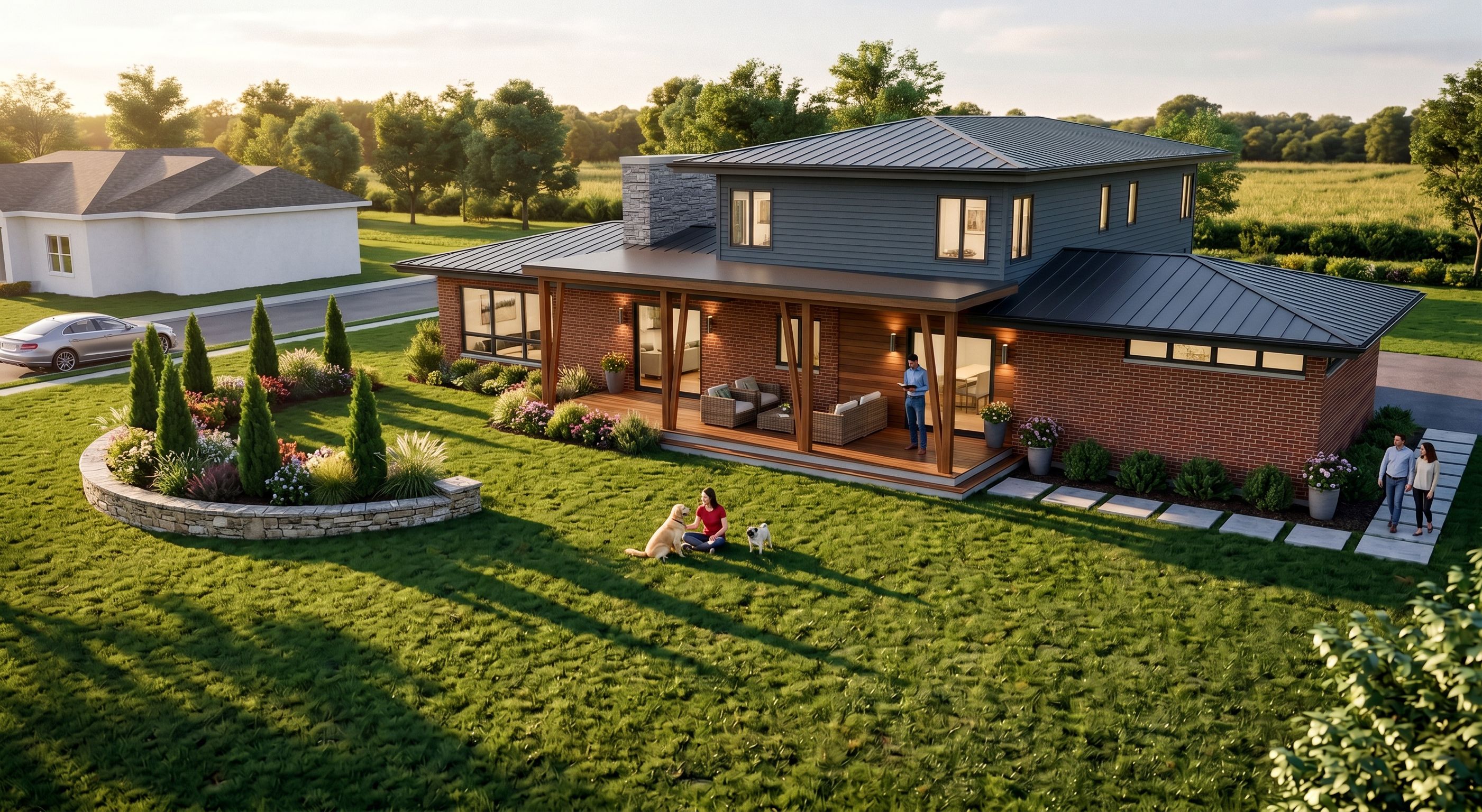 Photo of a contemporary single-family home nestled in a lush, blue lap siding green landscape. Highlight the warm wooden elements, clean lines, and modern textures. The inviting porch features stylish outdoor seating surrounded by carefully manicured gardens and native trees. Natural sunlight casts soft shadows, creating a serene atmosphere during golden hour. Capture the scene from a slightly elevated angle, using a wide-angle lens to encompass both the home and its vibrant surroundings, enhancing the spacious feel of the property., keep exact camera angle