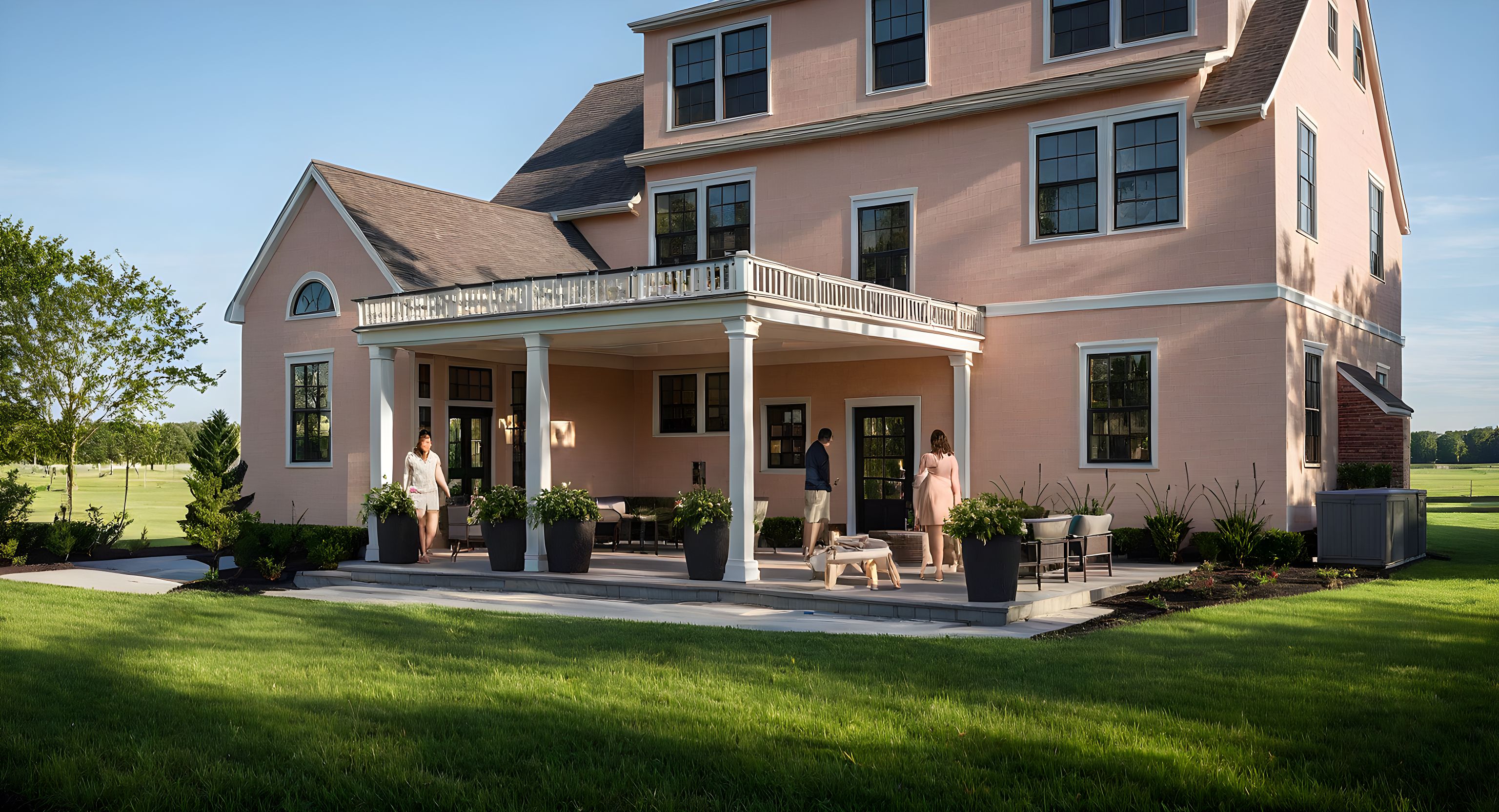 Photo of a classic two-story peach colored residential house featuring a welcoming porch and manicured landscaping. Architectural details include elegant window designs, a gabled roof with shingles, and decorative moldings. The house is surrounded by a lush green lawn, with outdoor furniture set up on the patio. Soft afternoon sunlight casts gentle shadows, highlighting the textures of the brick and siding materials. Captured from a slightly elevated angle using a wide-angle lens to emphasize the structure's charm and the surrounding space, inviting a sense of warmth and comfort in the scene.