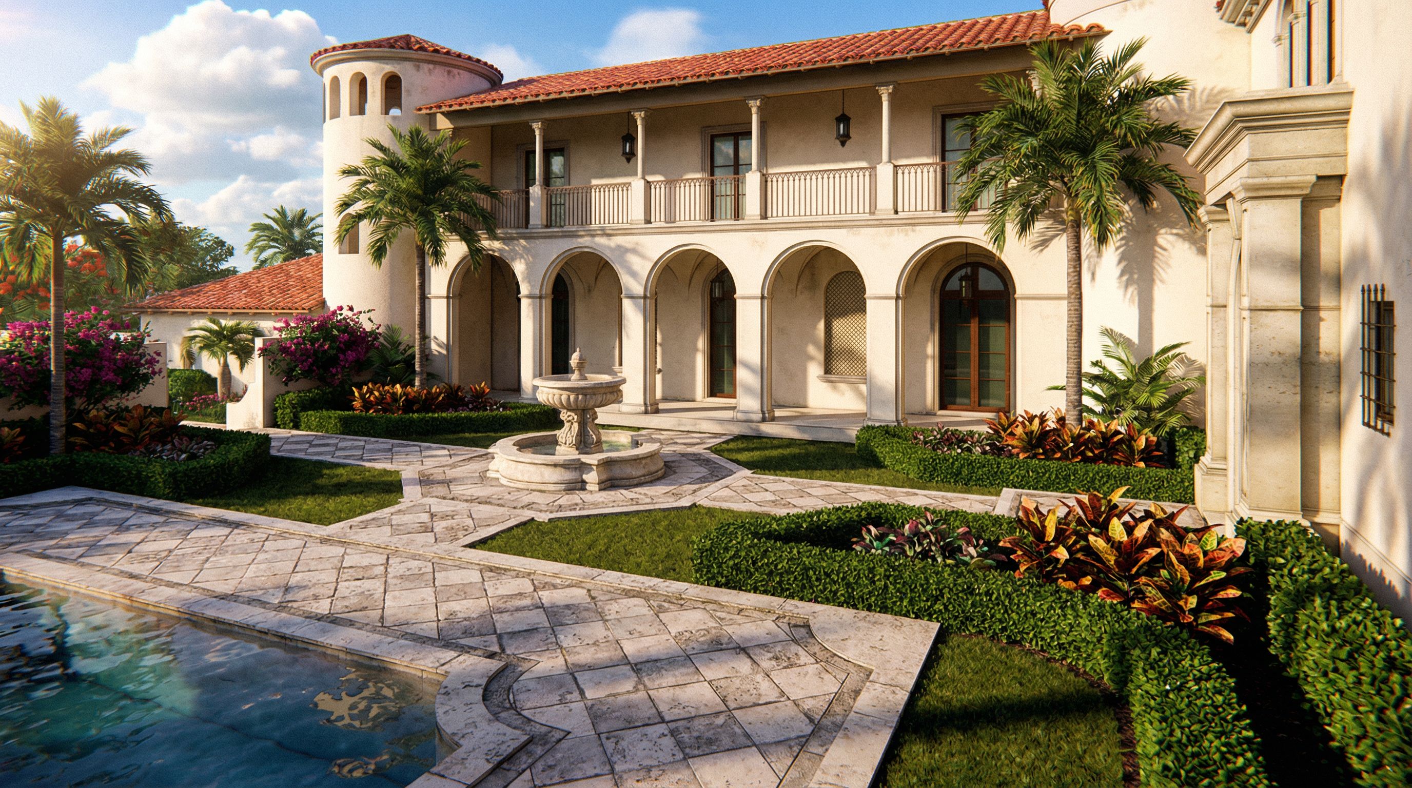 PromptDo not change the massing. I want a hyper realistic rendering. Money shot view. This is a front entry garden in palm beach Florida, match the color and materials but give realistic texture and landscaping. maybe a center piece of some sort in the circular area. , keep exact camera angle