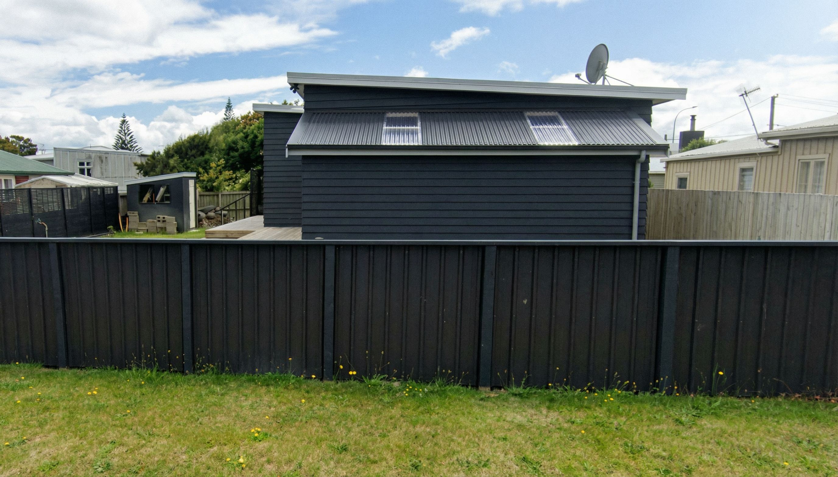the front elevation is to have a garage extension as shown. Dark corrugated roof with two clear sheets. walls to be dark horizontal weatherboards. grey fainted fascia and spouting. front of building is to be 1.0m back from the front fence. sunny day with clouds., keep exact camera angle