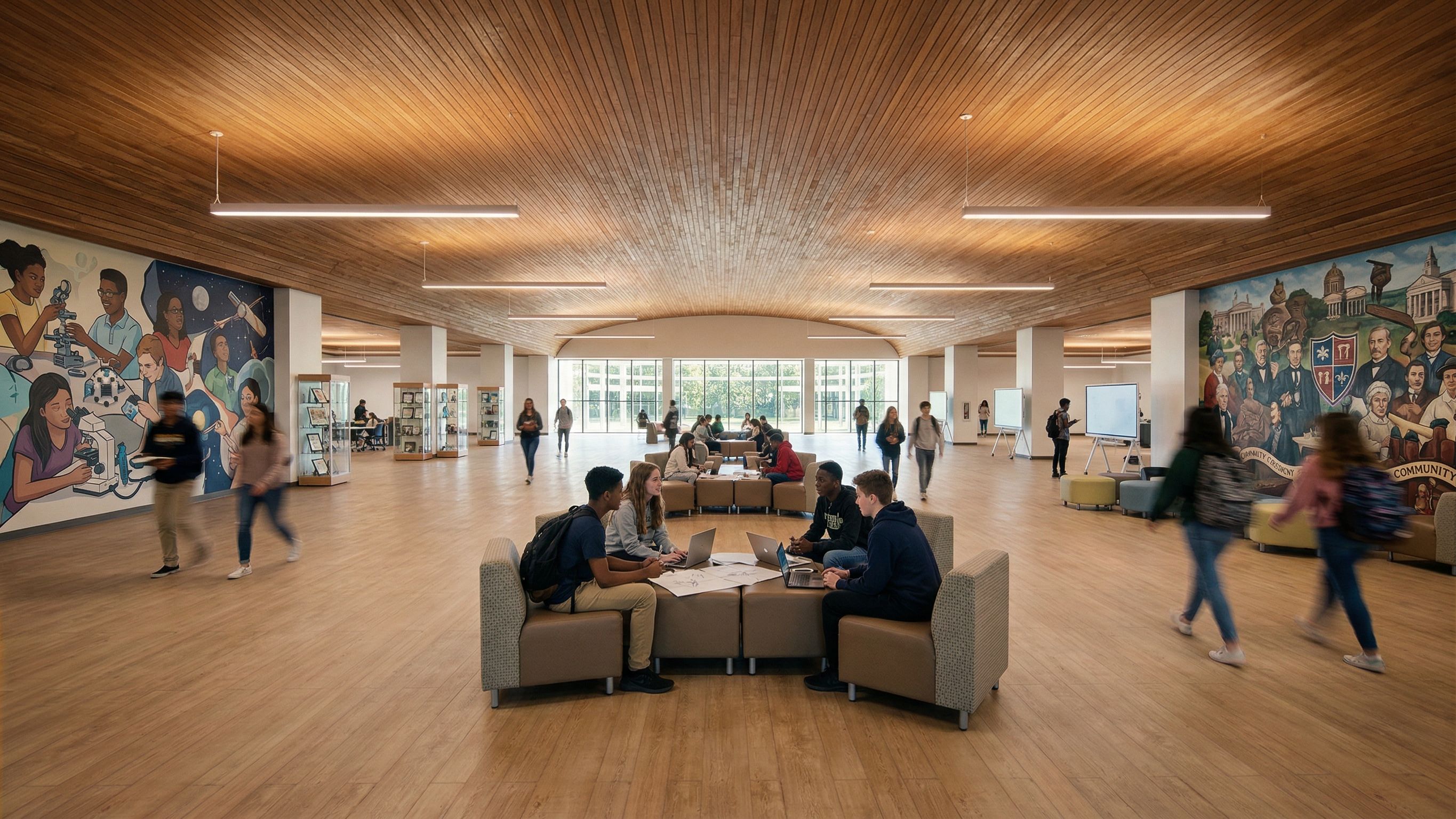 Promptit is the interior 0f school and it shows the inner interactive school add students interactive and add murals of high school and make the scene super realistic , keep exact camera angle