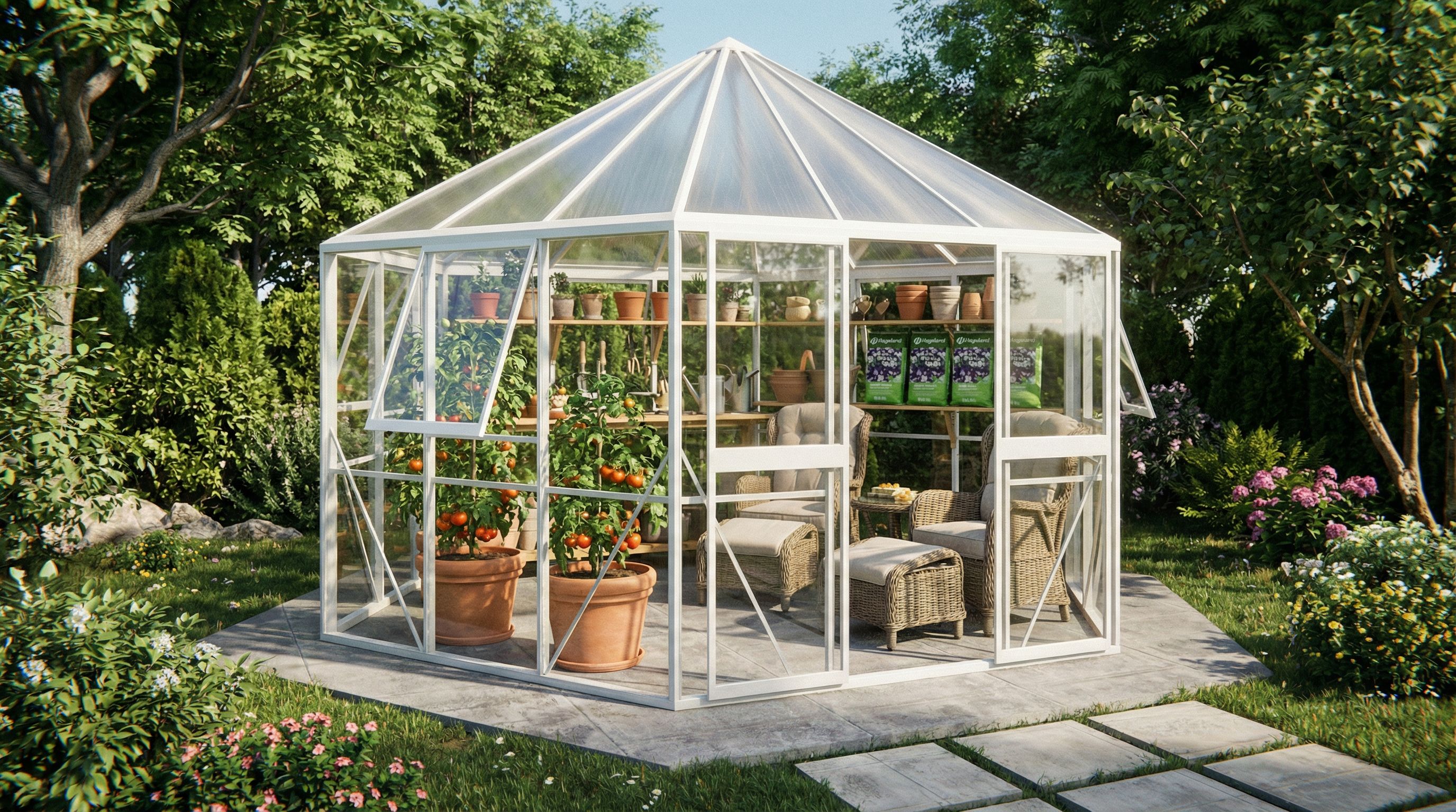 Can you optimize this visualization of a greenhouse so that it looks more realistic - both outside and inside? Make it in landscape view not portrait. I would like to two terracotta pots with tomato plants inside the greenhouse. One chairs like the ones in reference. You can also add shelves with pots and soil as in the reference pictures. No pots with plants in front of greenhouse.