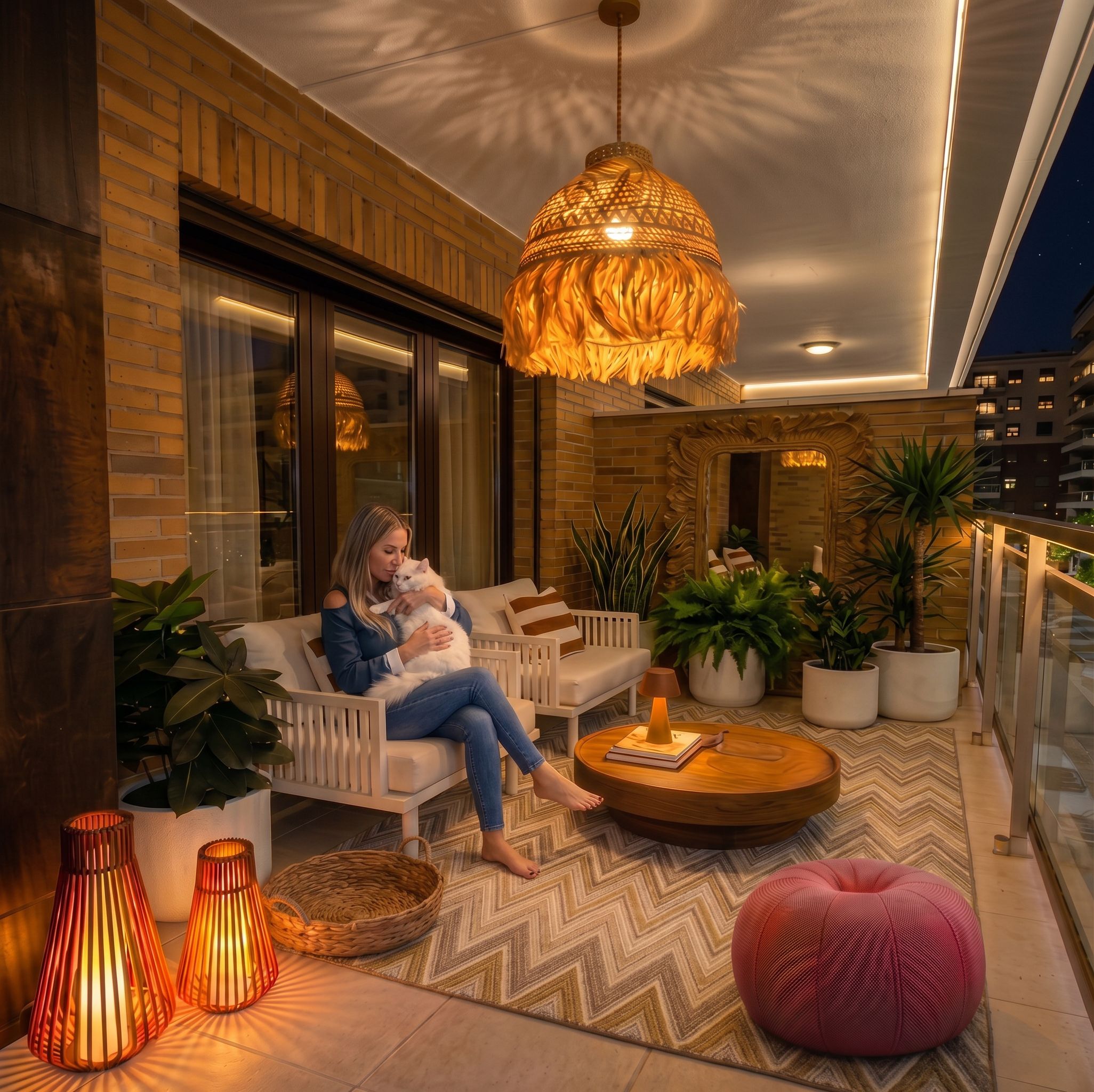 PromptRemover a gatinha do cesto. colocar a mulher sentada no sofá vestida com calças jeans e descalça com unhas dos pes pintadas de vermelho escuro, com a gatinha branca ao colo conforme foto de referência. remover tapete e colocar outro conforme referência , keep exact camera angle