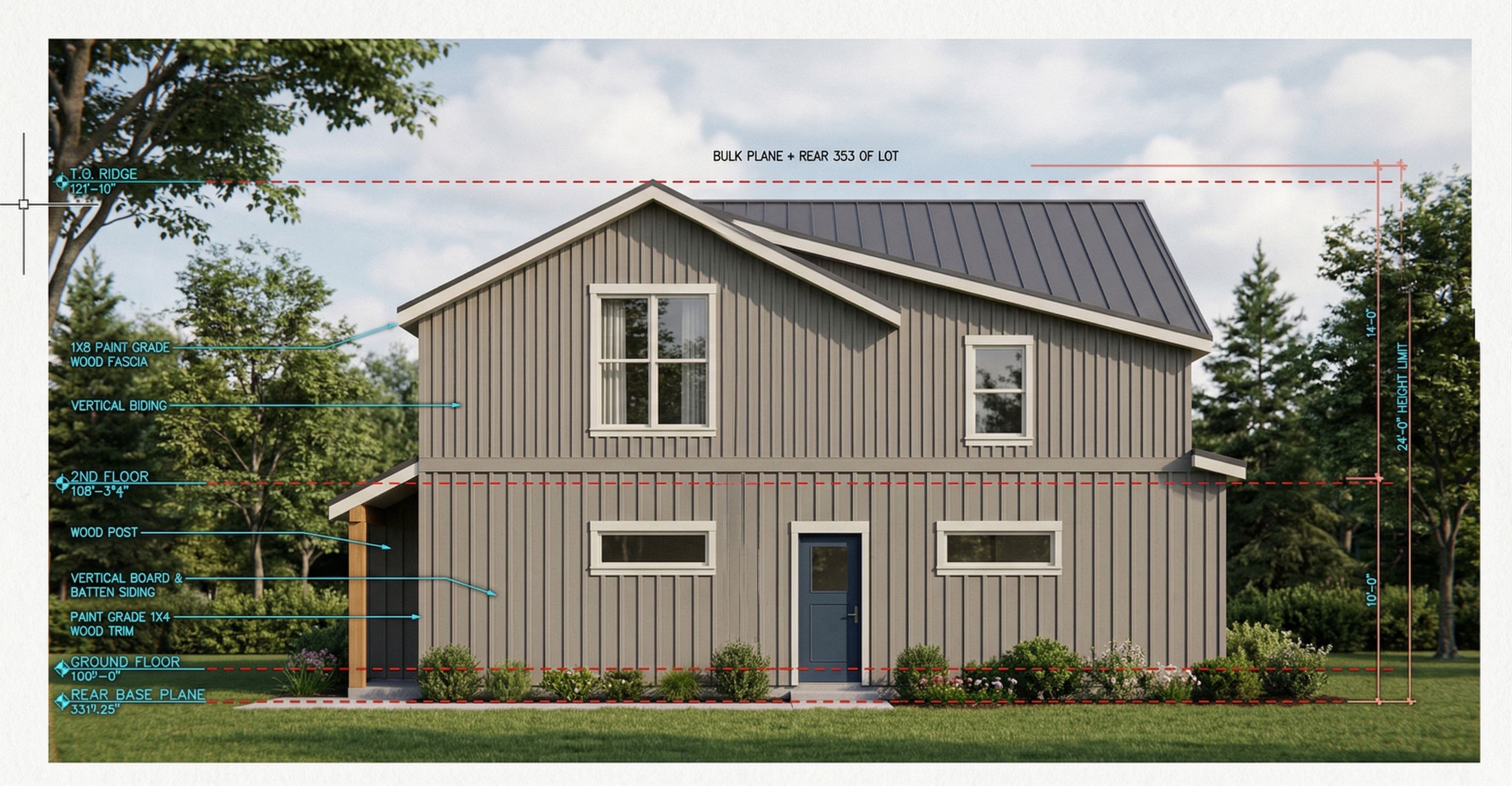 Create a high-quality, photorealistic architectural rendering based strictly on the attached architectural elevation drawing. Important instructions: Do not change the building design, proportions, roof shape, window sizes, window locations, or door placement. Do not add or remove architectural elements. Follow the exact geometry and layout shown in the drawing. Use the materials described in the drawing notes. Materials and architectural features to render: Exterior siding: Vertical board and batten siding Trim and fascia: Paint grade wood fascia Structure: Wood posts supporting the upper level Lower siding trim: Paint grade 1x4 trim boards Roof: Standing seam or architectural shingle roof dark neutral tone Windows: Simple residential windows with trim Door: Single exterior entry door with trim Rendering style: Ultra-realistic architectural visualization Accurate material textures painted wood siding, trim, fascia Natural daylight lighting Soft shadows and global illumination Neutral natural color palette Realistic environment context simple grass ground plane Clean architectural presentation suitable for client presentation Camera view: Straight elevation perspective matching the drawing view Eye-level architectural visualization Entire building visible Quality requirements: Ultra-high resolution Photorealistic materials Sharp details Professional architectural visualization quality Restrictions: Do not modify the architecture Do not change window placement Do not add additional architectural elements Only translate the CAD elevation into a realistic rendered building using the specified materials, keep exact camera angle