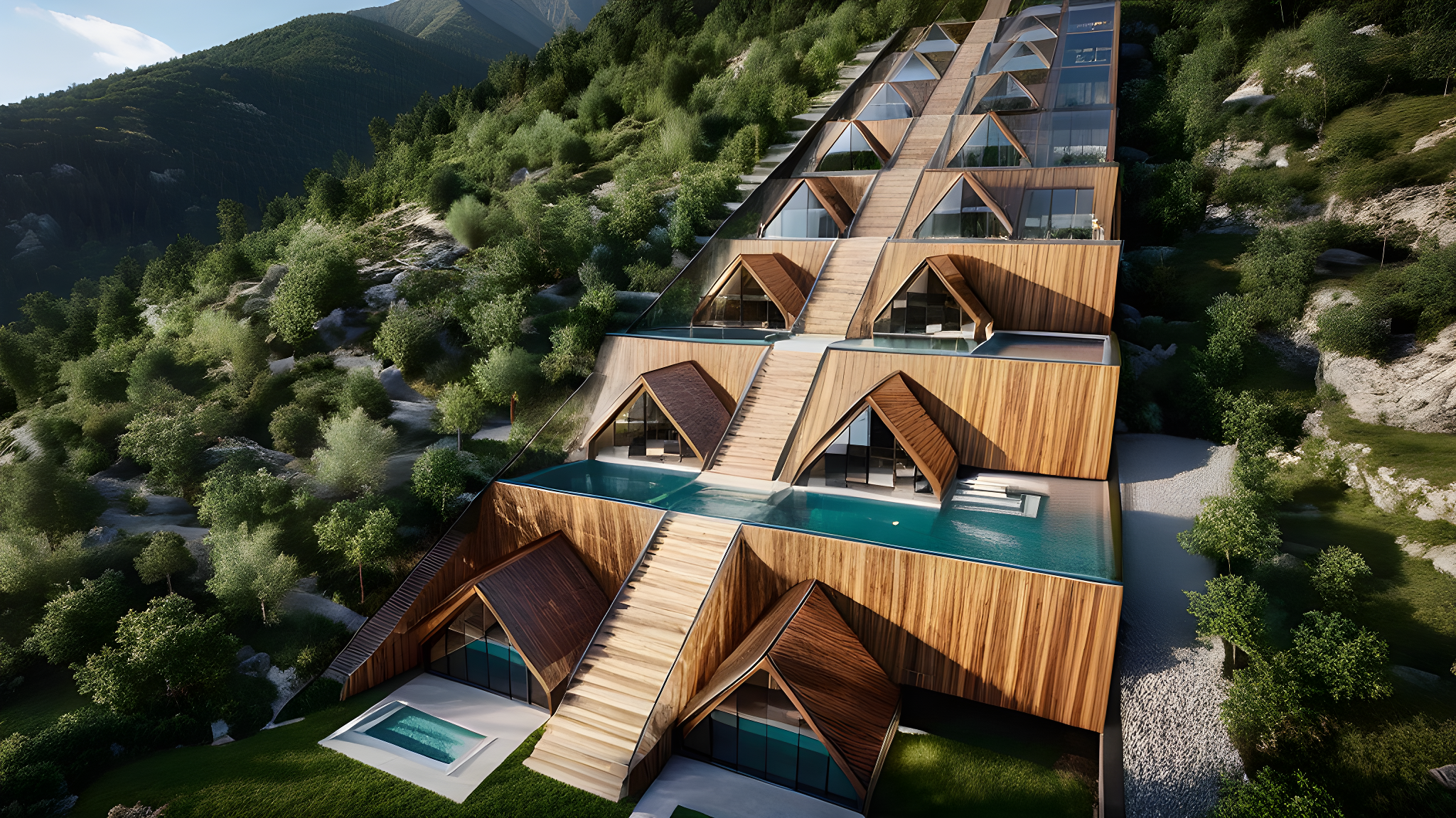 WOOD ARCHITECTURE AND GLASS, SWIMINGPOOL, GRASS, MOUNTAIN LANDSCAPE