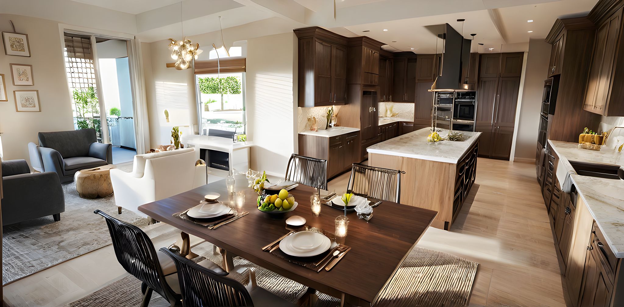 PromptPhoto of a contemporary open-concept kitchen and living space featuring elegant furnishings. Emphasize sleek cabinetry, polished marble countertops, and rich wooden accents. Include a dining table set with plates and a fruit centerpiece, and highlight soft textures in the rugs and upholstery. The environment is brightened with natural light from expansive windows, casting soft shadows across the room. Capture a slightly elevated angle that showcases the interconnected areas, using a wide-angle lens to encompass the full ambiance of the space, enhancing the feeling of warmth and inviting design.