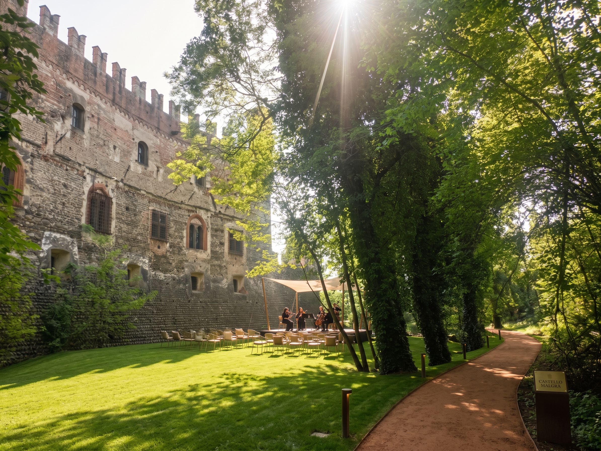 PromptCastello Malgrà alla base delle antiche mura c'è un piccolo prato in pendenza da sistemare in modo curato per ospitare un concerto di musica classica con piccolo palco. Sulla destra sistemare con terra stabilizzata il sentiero che appena si vede . Migliorare la sistemazione arborea , keep exact camera angle