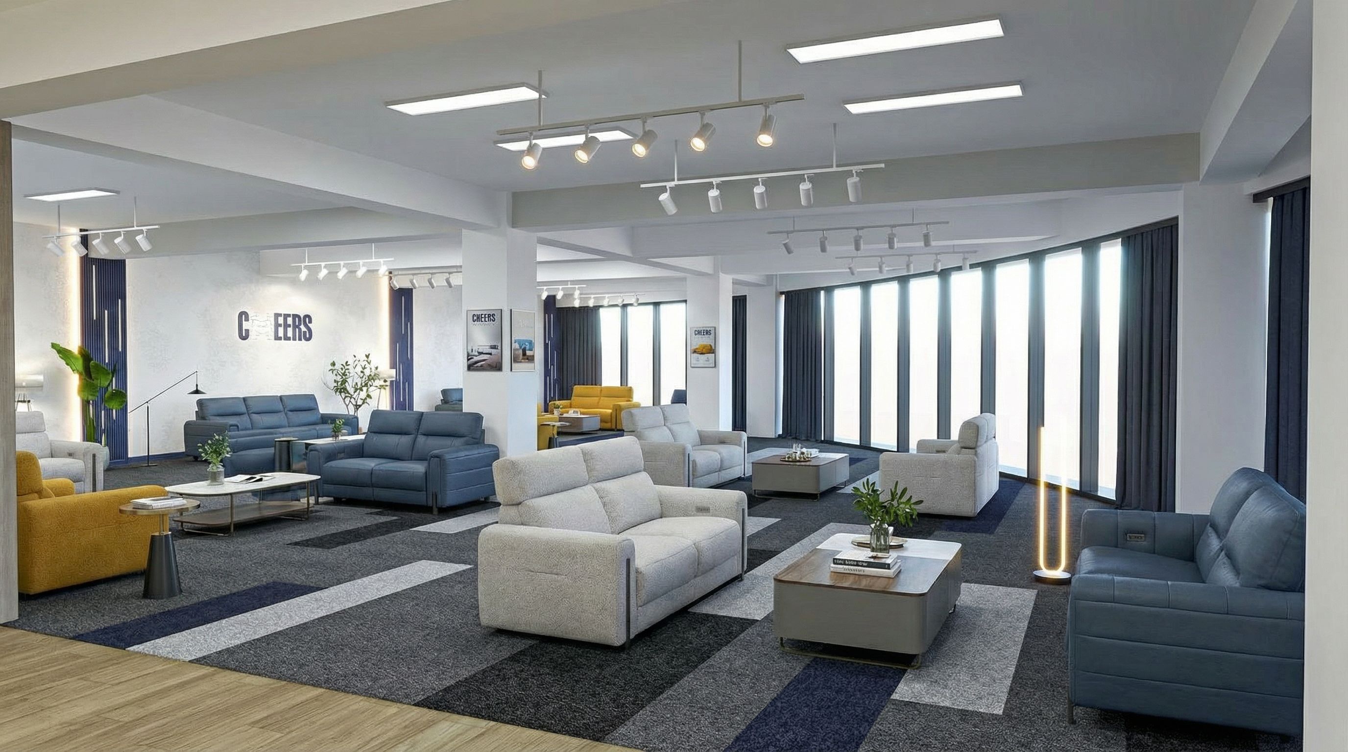 Promptinterior design rendering, render this photo into photorealistic rendering, Fill this area "CHEERS" brands sofas from reference section's image. Concept is similar with reference's first render. /Previous render/ This is continue. Do not change building area's position. Increase sofa amount. Modern plain curtain concept colored, Decorate columns brands vibe., eye level view, overcast day with diffused lighting, high quality, professional, detailed scene