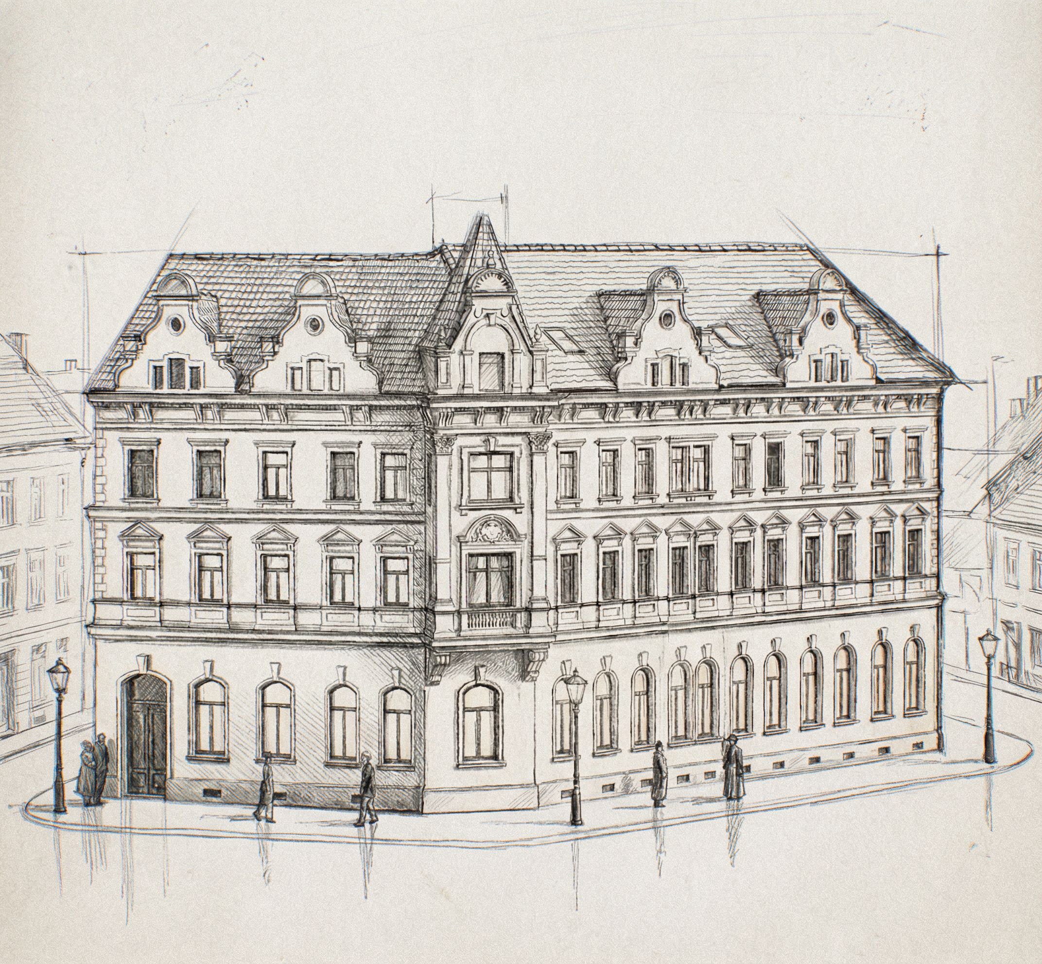 make it looks like artistic architectural sketch af a building...aplly the style of drawing used in reference photos...make it just by pencil no colors just lines and textures....much less details and make it very simple and very like a quick sketch that is not perfect and no straight lines, keep exact camera angle