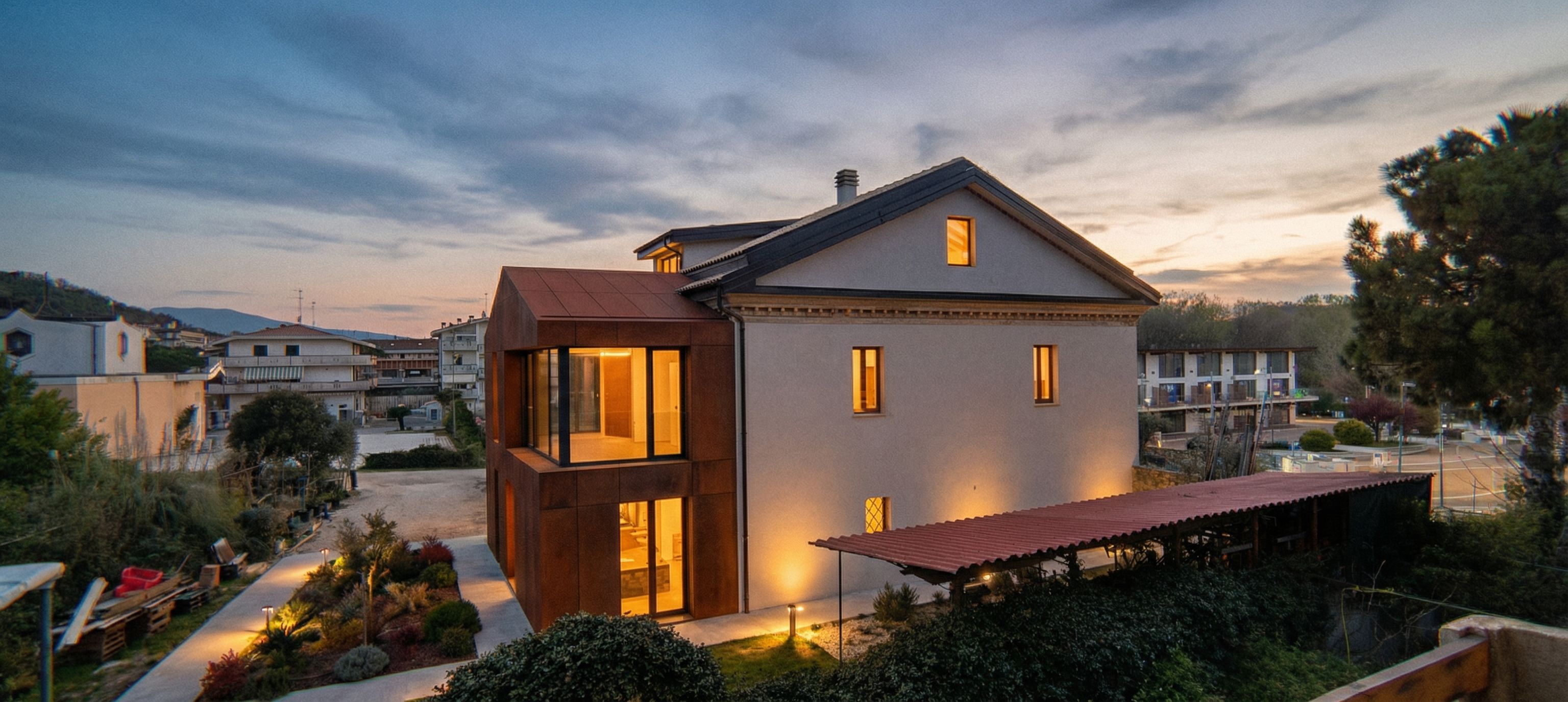 add to the front of this house, in place of the terrace, a very modern volume with Corten-colored stoneware cladding and large windows and stoneware roof cladding., keep exact camera angle