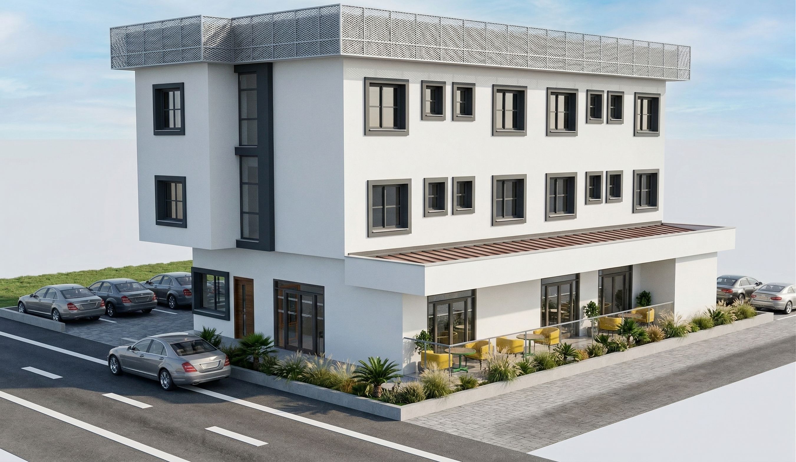 conserve l'ambiance de l'image mais utilise de code de couleur de l'image de référence pour le choix de la peinture. pas d'écriture sur l'image a générée. je ne veux pas les bâtiments autour de image. utilise le même style de toiture que l'image de référence. avec les couleurs un peu plus vives, keep exact camera angle