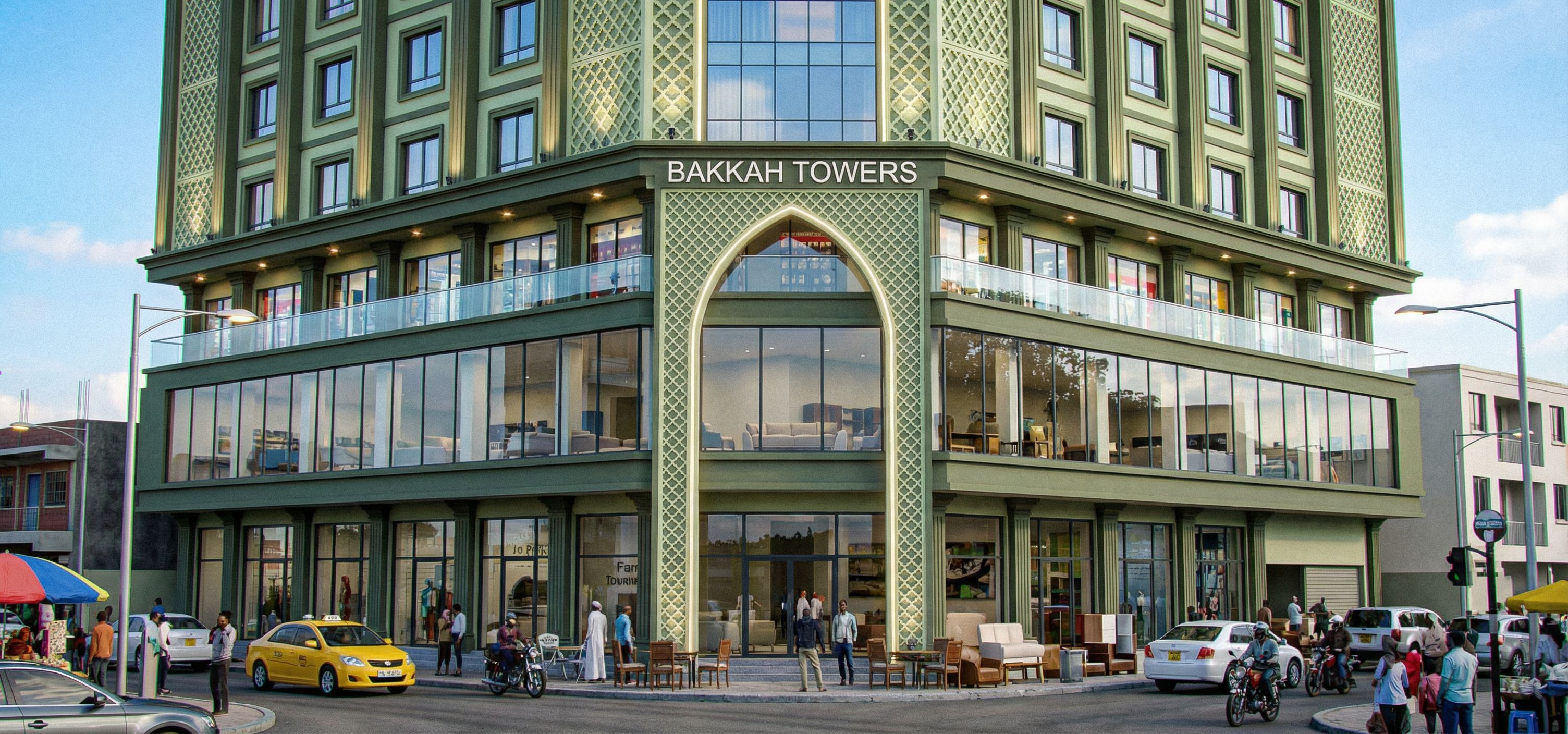 MAKE GLASS CLEAR, REFLECTIVE AND REALISTIC. USE THE COMBINATION OF COLOURS IN THE REFERENCE IMAGE. WRITE NAME"BAKKAH TOWERS" AT THE TOP CORNER JUST ABOVE THE ARCH. MAINTAIN NUMBER OF LEVELS OF BUILDING AND CAMERA ANGLE. INTRODUCE CURTAIN WALLING BEHIND THE LATTICE WORK. RENDER OF A BUILDING IN EASTLEIGH AREA IN NAIROBI DURING THE DAY. TWENTY STORIED BUILDING WITH GROUND FLOOR AS COMMERCIAL, FIRST FLOOR FURNITURE SHOP WITH CLEAR GLASS AND SECOND FLOOR SHOPS WITH GLASS BALCONY. THE REST OF THE FLOORS APARTMENTS. SHOW THE WHOLE BUILDING TO THE TOP AND INTRODUCE CURTAIN WALLING BEHIND THE MASHRYABIYA. USE COMBINATION OF A LIGHT PASTEL GREY AND WHITE ON THE BUILDING. INTRODUCE ROPE LIGHTS , STREET LIGHTS AND SPOT LIGHTS IN THE BUILDING. MAINATIN DESIGN OF ORIGINAL IMAGE, CHANGE COLOUR ONLY. USE SHADES OF BEIGE ON THE BUILDING. AMINTAIN CAMERA ANGLE. CHANGE COLOUR TO THE COMBINATION OF TWO COLOURS IN THE REFERENCE IMAGE. SHOW IMAGE ALL THE WAY TO THE TOP. SHOW BUILDING ALL THE WAY TO THE ROOF. SHOW THE WHOLE BUILDING., keep exact camera angle