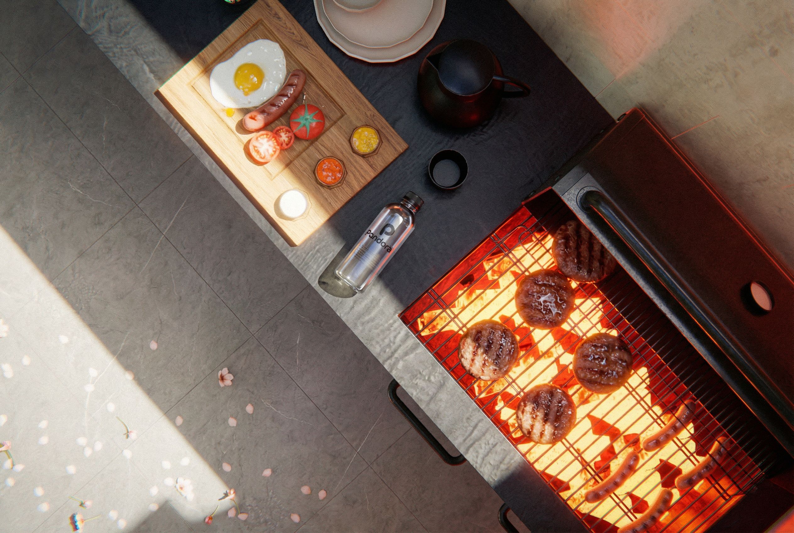 Ultra-realistic top-down render of a barbecue grill. Show hamburgers, hot dogs, eggs on a tray, hot dogs, and a Pandora drink clearly. Preserve the exact composition and all food arrangement without any changes. Apply realistic sunlight and cinematic lighting, with high-quality textures for meat, eggs, metal grill, and glass. Enhance details, reflections, and shadows to make the food look extremely realistic. Photorealistic, high-resolution, detailed render.”, keep exact camera angle
