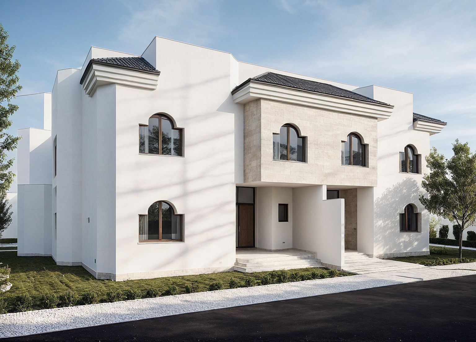 Modern Villa , Large-format rectangular travertine marble on the center , Floors , with white paint wall ,Curtains on the walls and windows , tree