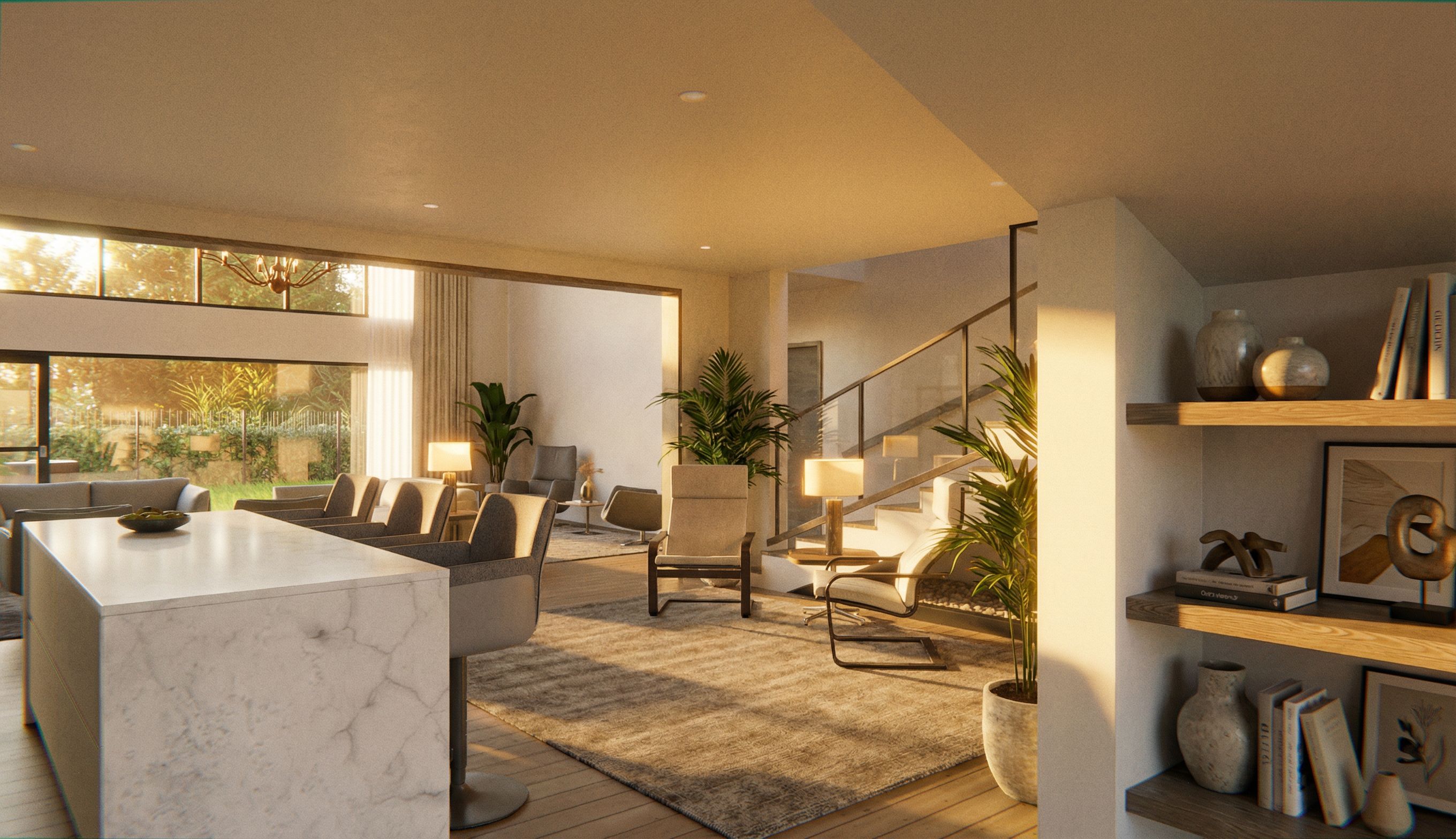 An expansive interior living space features a large white marble kitchen island with grey bar stools, adjacent to a living area furnished with comfortable sofas and armchairs. A prominent staircase with a glass railing ascends in the background. The room is filled with bright daylight streaming through large glass windows, offering a view of lush green grass and verdant foliage outdoors. The storage on the right is filled with decor pieces. Keep the exact camera angle., keep exact camera angle