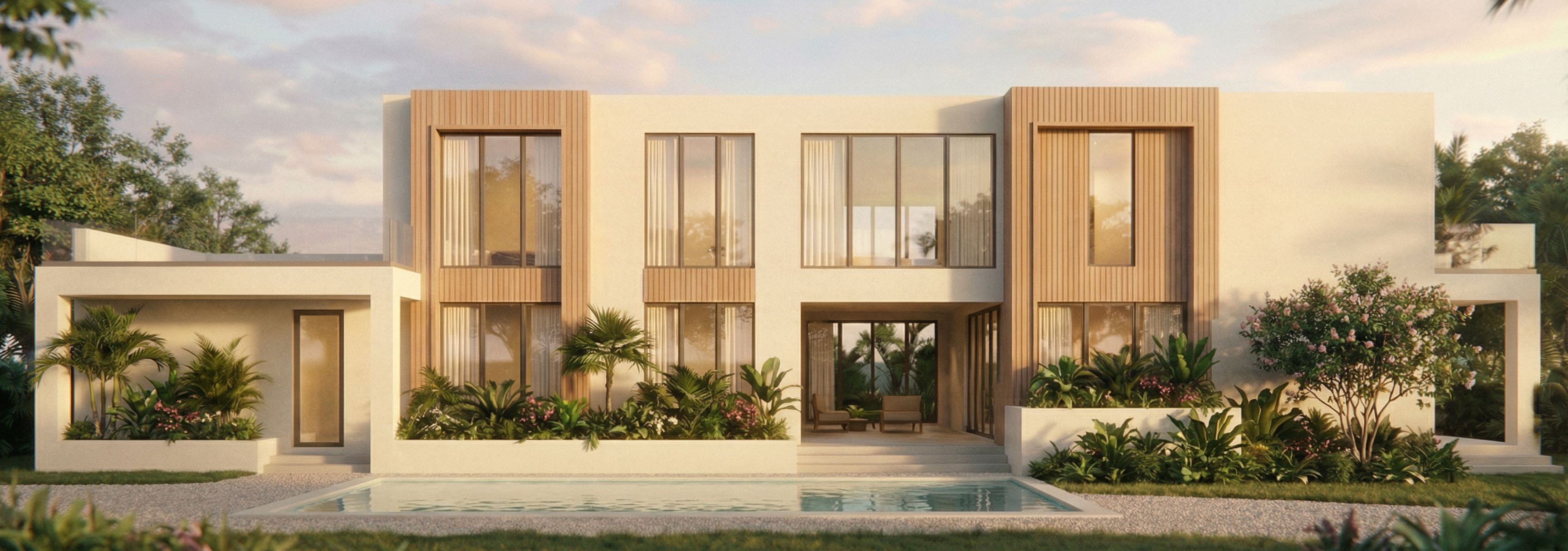 Make this more photorealistic. the planter boxes only come 1 ft off of the building. and they are only placed in front of the windows. the planter box all the way on the right is not a planter box but a patio off of a bedroom with stairs that lead down to the pool. it does have a 3ft white stucco wall around it though. there is a white square column that support the overhang of the cabana. and the cabana has an elevation patio that comes off of it where that side door is. can you do a small pecky cypress frame around the windows that have the pecky cypress around it but nothing in the middle. , keep exact camera angle