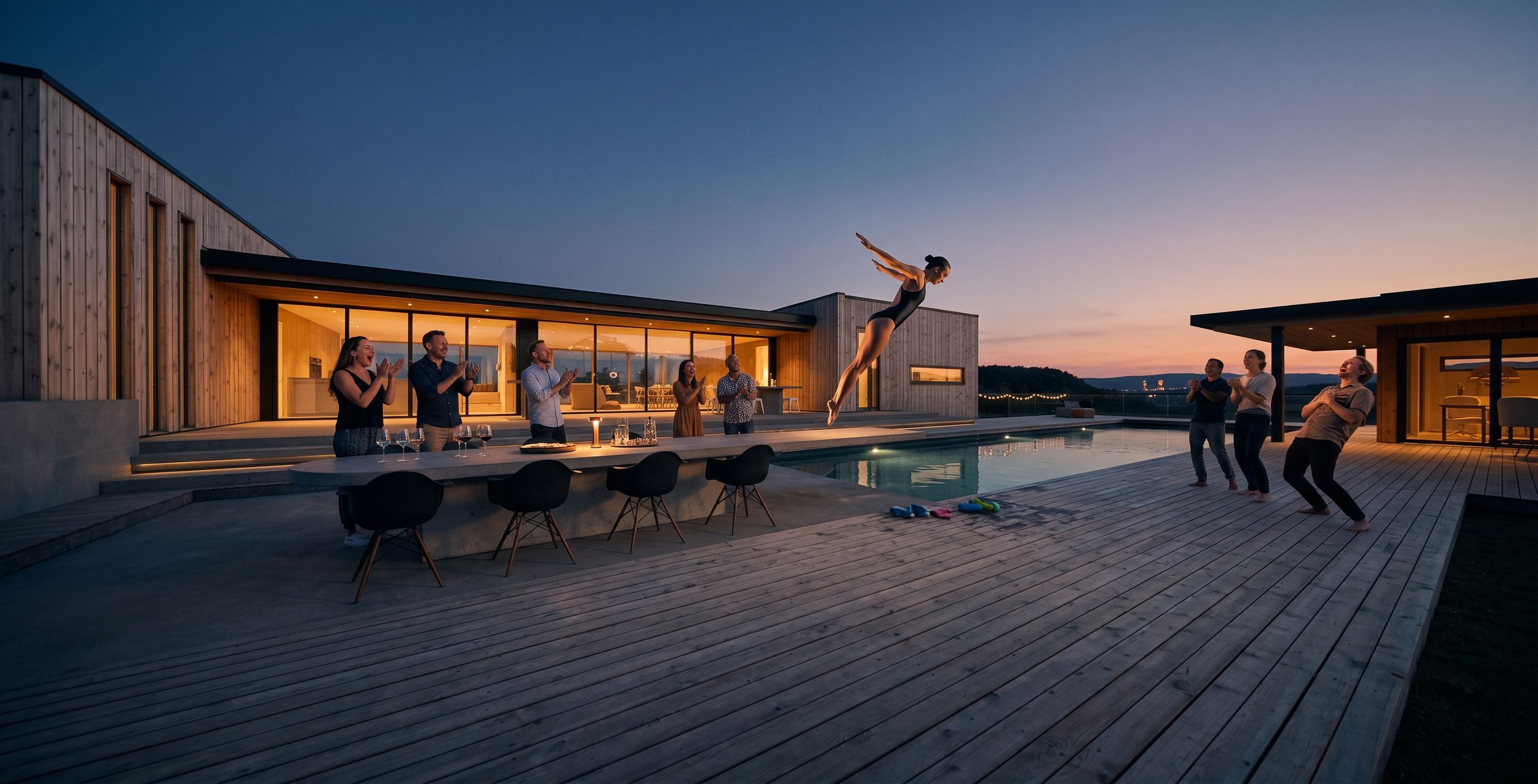 Make picture exactly like picture. Pool area outside building wich has a very horizontal and clean architectural facionable style, clean lines, subtle, nordic, nice, perfect party where the dining table is also the diving board, people clapping and grasping for air and screaming. glasses on the table. its a very late night. Sun going down but lights up the woman diving from the edge of the table into the pool Make people naturally enjoy environment, keep exact camera angle
