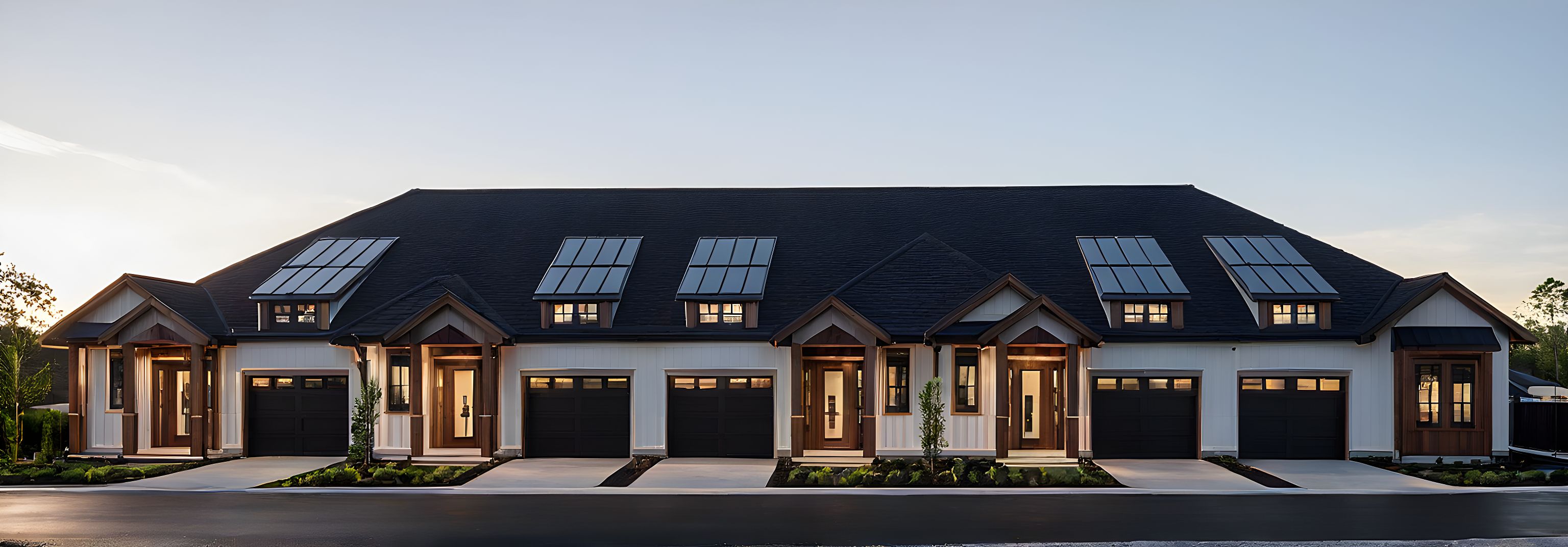 PromptPhoto of a modern multi-family residential building, featuring gabled roofs and decorative wood accents. Emphasize the juxtaposition of white paneling against dark roofing, with large windows that invite natural light. Set within a suburban landscape, surrounded by lush greenery and paved walkways. The lighting captures a serene afternoon glow, casting soft shadows on the facade. Perspective from the front at eye level, with a focal length of 35mm to highlight the architectural details and gentle curve of the driveways leading up to each unit.