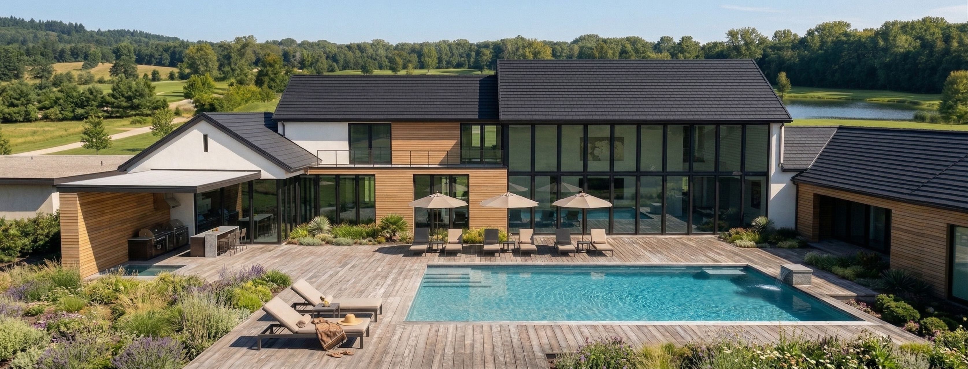 quitemos las piedras del revestimiento y coloquemos revestimiento de tablilla y pared lisa con pintura blanca y todos los techos con tejas negras, como hiciste en la referencia