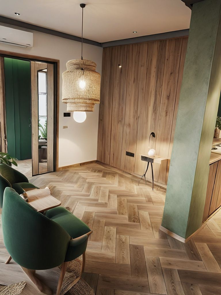 PromptDinning space, warm color palette, boho style, beige tones, dinning round wood table, white walls, green chairs, boho lamp
