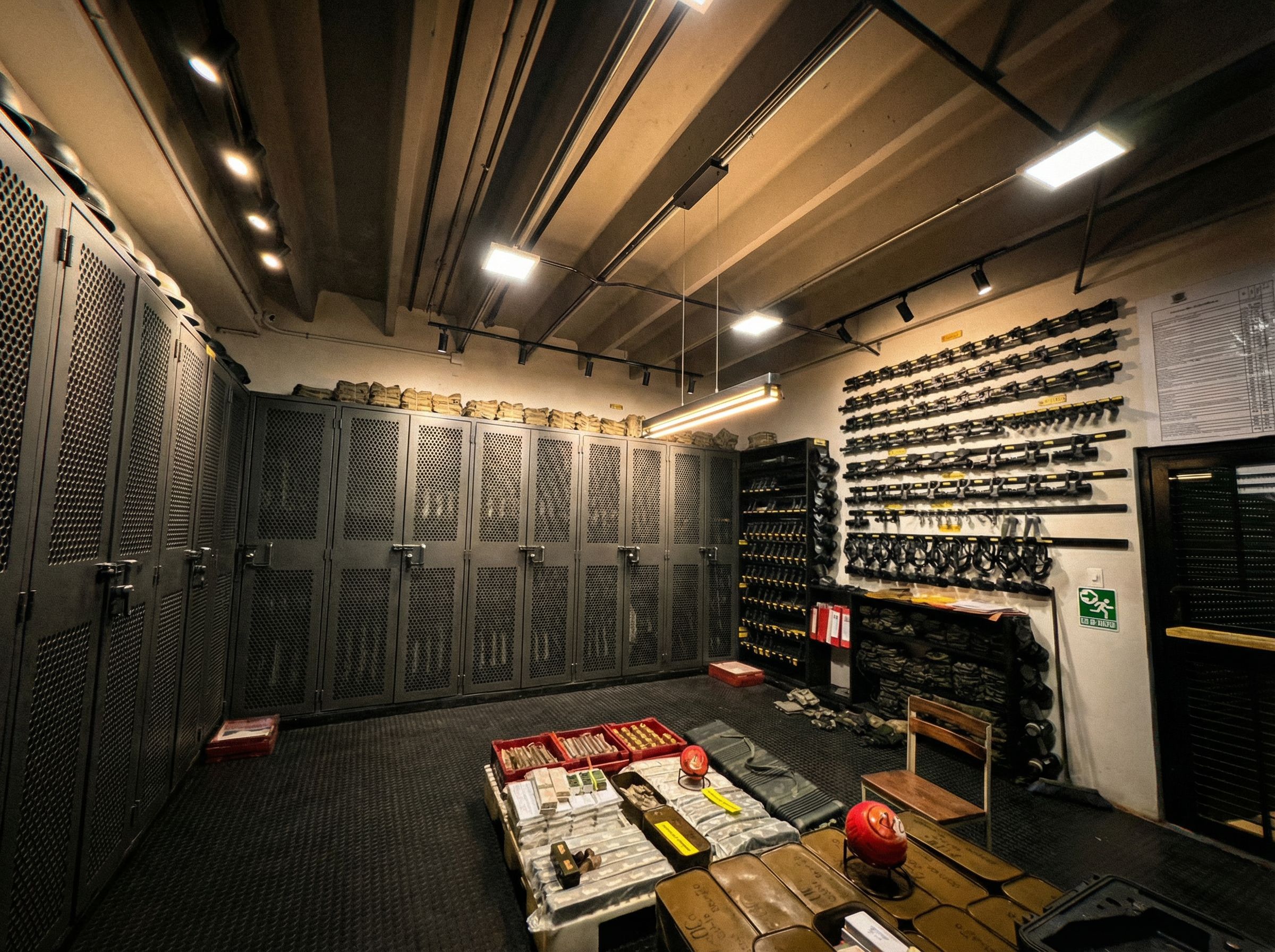 Promptme ayudas a proponer una iluminacion mucho mas moderna, a colocar el suelo de goma, y a cerrar los armeros con puertas metalicas que tengan cerradura, se debe ver muy bonito pero con estilo industrial , keep exact camera angle