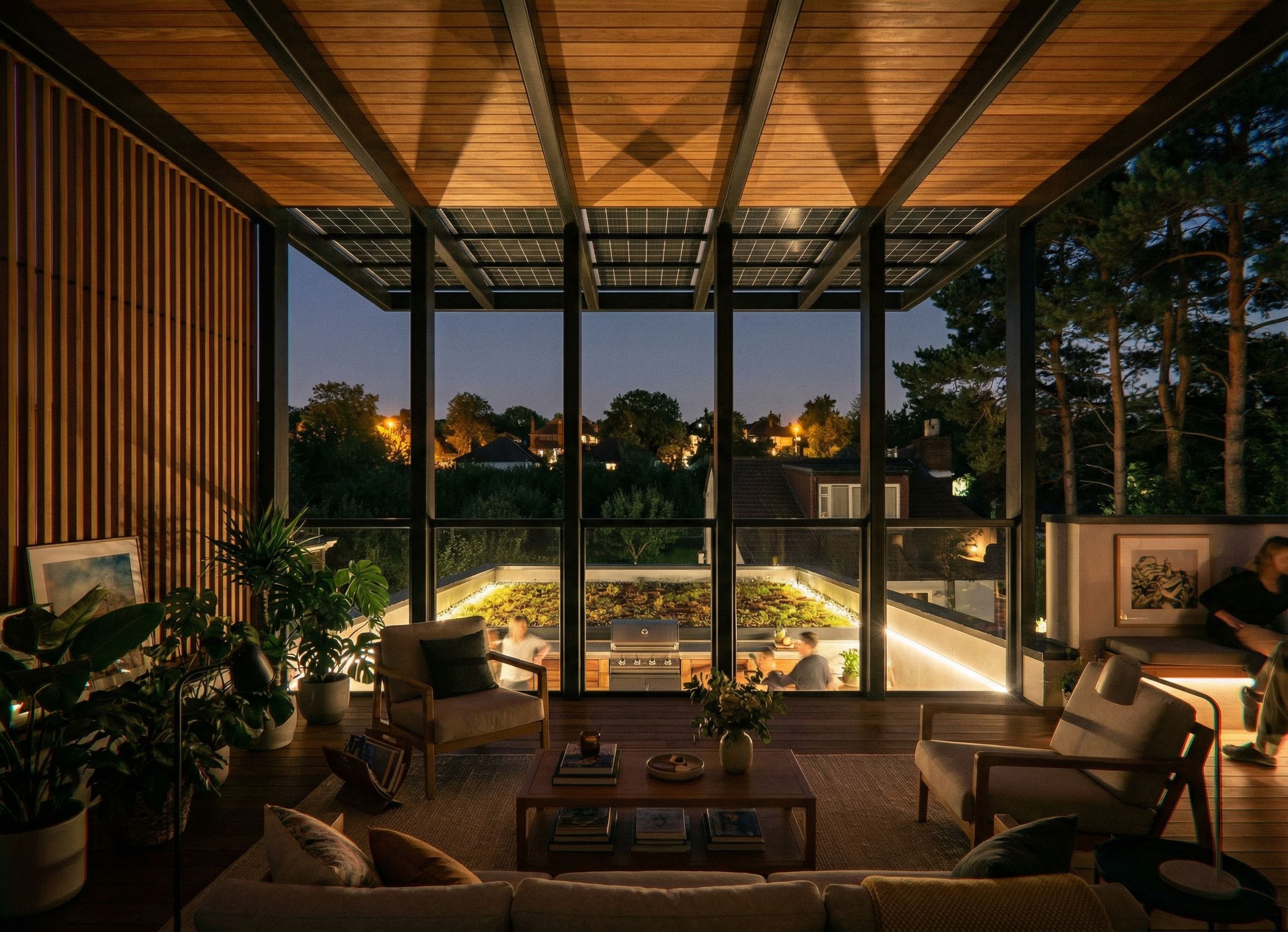 Wood roof deck, skinny 3 x 3 metal trellis with solar panel roof, wood privacy screen left side, overlook green roof beyond decking, over orchard straight ahead and through tall Scot's pine to the right, BBQ, views to suburban rooftops and trees beyond Follow geometry , keep exact camera angle
