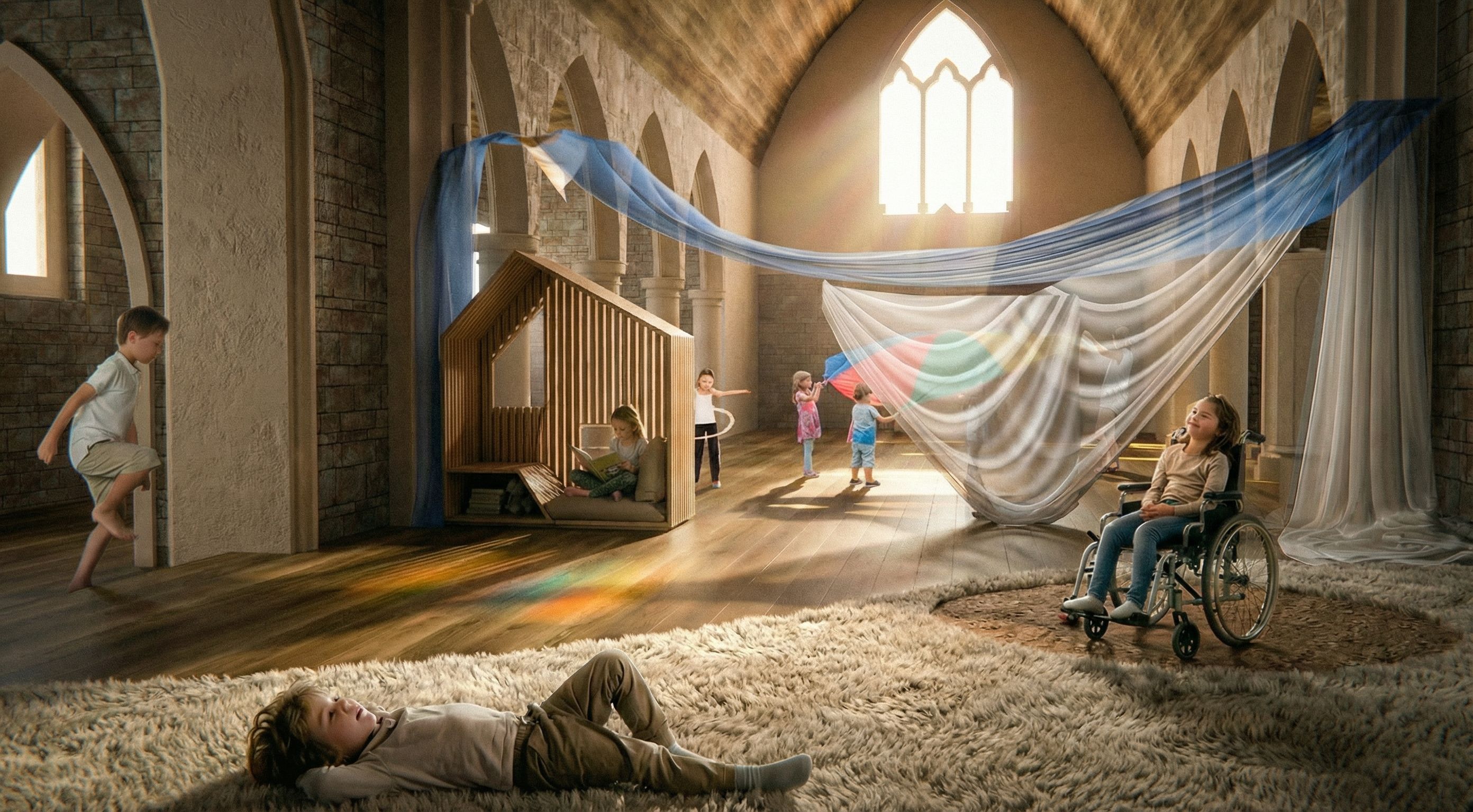 Promptadd people like in reference image and make carpet fluffier and timber nook slated acoustic timber. and add fabric draping across the stone arches, keep exact camera angle