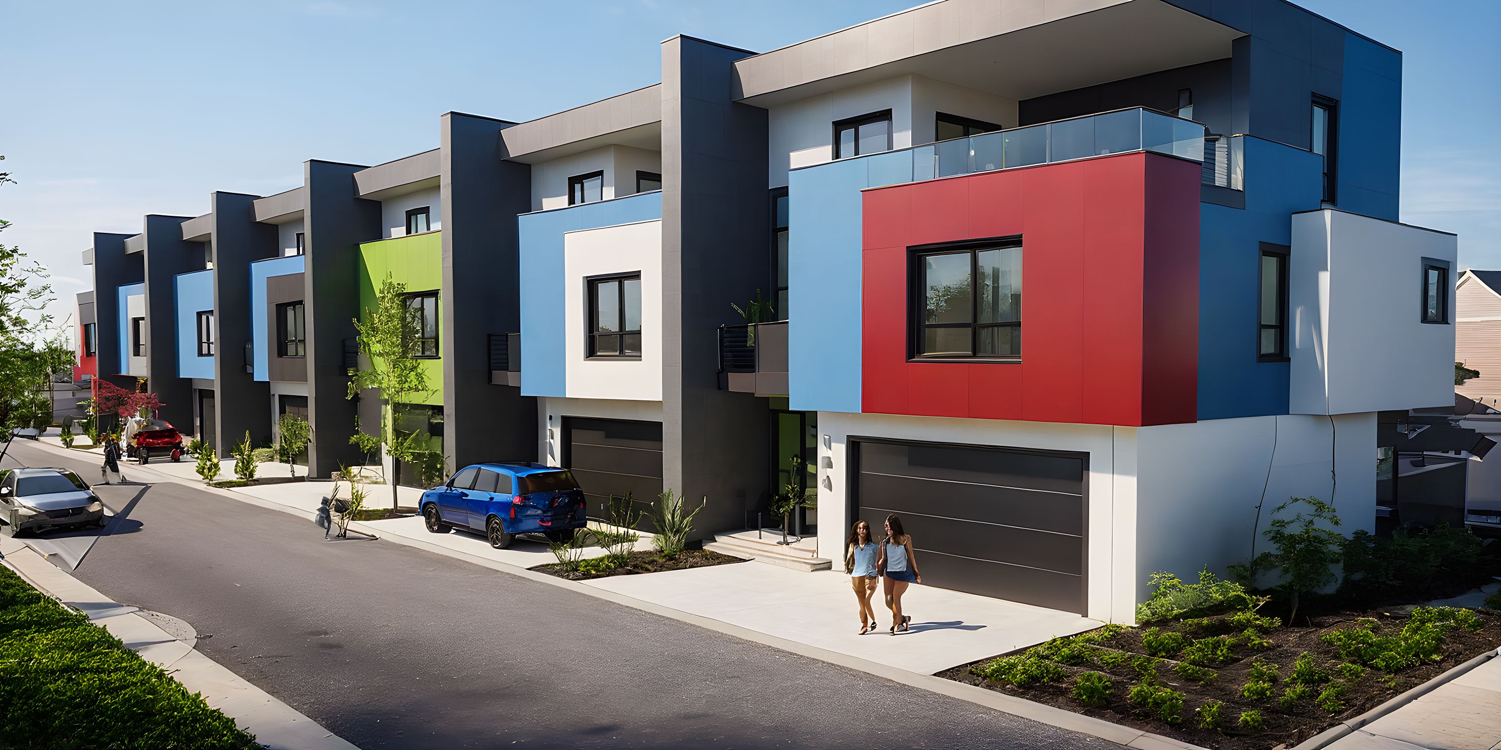 PromptPhoto of modern townhouses featuring a mix of bold colors like red, green, and blue with sharp angular designs. Emphasize the smooth textures of the materials and large windows that invite natural light. Situated in an urban setting with greenery along the sidewalk and surrounding vehicles. Bright daylight casts soft shadows, enhancing architectural details. Perspective from street level at a slight angle, showcasing the façade and inviting entryways, with a focus on a wide lens to capture the neighborhood's vibrancy and dynamic atmosphere.