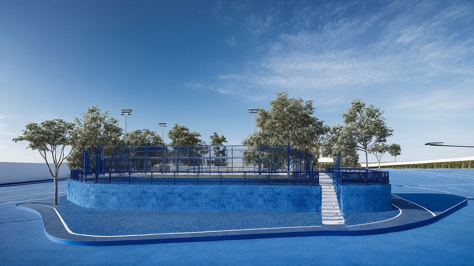 KEEP THE STRUCTURAL AND ARCHITECTURAL DESIGN. KEEP THE ORIGINAL TEXTURE AND BLUE COLOR OF THE STRUCTURE OF THE PADEL